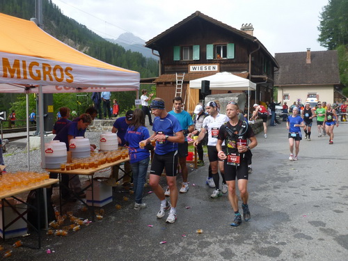 Gerade rechtzeitig erfolgt der Batteriewechsel, denn nach Kilometer 25 wieder ein Höhepunkt. Die Station Wiesen (1197 Meter) mit dem Viadukt. Verpflegung, Moderation und dann geht es nach einigen Metern auf das Wiesner Viadukt. Viele Zuschauer nutzen die Rhätische Bahn auf der Linie Davos – Filisur und können so das Rennen live, in Farbe und in der ersten Reihe hautnah verfolgen.