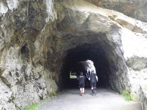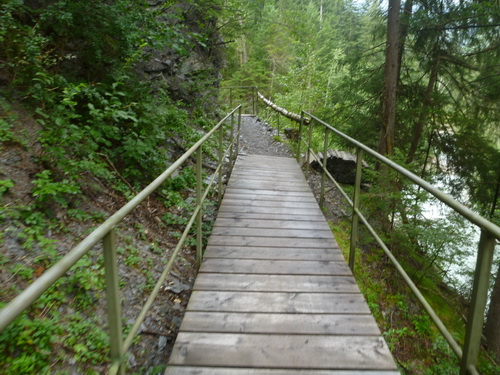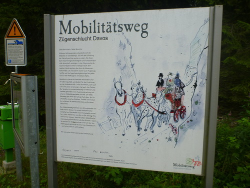 Seit Monstein haben wir auf kurzem Wegstück fast 300 Höhenmeter verloren. Ab Schmelzboden (Kilometer 20) beginnen idyllische und auch sehenswerte Kilometer durch die Zügenschlucht. Neben uns tost das Gewässer der Landwasser. Wie viel Kraft das Gewässer hat, hier kann man es sehen und hören, denn tief hat sie sich in das Gestein eingegraben. Die breite alte Schotterstraße führt mehrmals durch kleine, dunkle Tunnels. Ein eigenartiges Erlebnis.