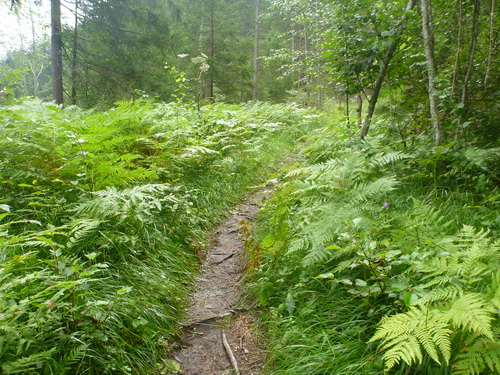 Zuerst ist unser Kurs noch gefällig, doch dann kommen noch die letzten 50, 60 Höhenmeter auf üblichem Laufterrain. Weg schmal, über Wurzeln, einige Drecklachen, bergauf und über Holzbrücken. An einer Stelle hängt der Farn weit in den Weg hinein. Wirklich toll, so ein Finale.