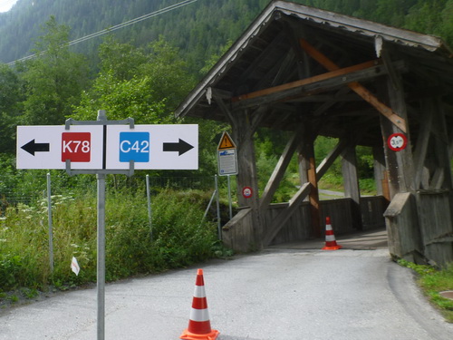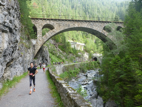 Etwa einen Kilometer laufen wir noch in das Albulatal hinein, bis dann bei Frevgias (1019 Meter) die Streckentrennung kommt. Nach der überdachten Holzbrücke über die Albula heißt es links für den K78 und rechts für uns. Während linkerhand rund zehn Bergläufer zu sehen sind, gilt auf meinem Weiterweg das Gegenteil. Ich sehe gerade einen Läufer in rund 150 Meter Entfernung.