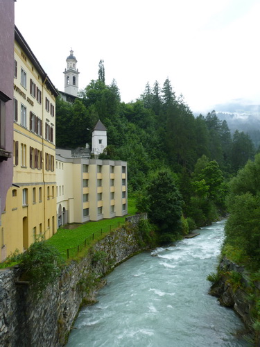 Auf schnellem Weg erreiche ich Alvaneu Bad (940 Meter). Der Hauptort liegt auf einer Terrasse leicht oberhalb am Hang. Seit gut zehn Jahren kann man hier sich in einem Wellness-Tempel erholen, denn das Thermalbad mit dem 34 Grad warmen Schwefelwasser bietet neben Dampfbad und Sauna beste Voraussetzungen. Ach ja, dass ich seit geraumer Zeit auf dem Wasserweg unterwegs bin, möchte ich nicht verschweigen. Für ein Bad reicht meine Zeit nicht, aber für einen Zug aus der Colaflasche bei der Tankstelle. Immer wieder haben wir schöne Ausblicke auf Landwasser und Berge.