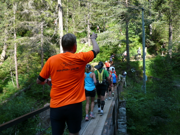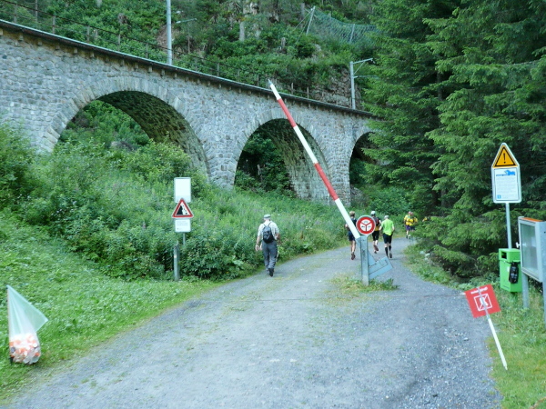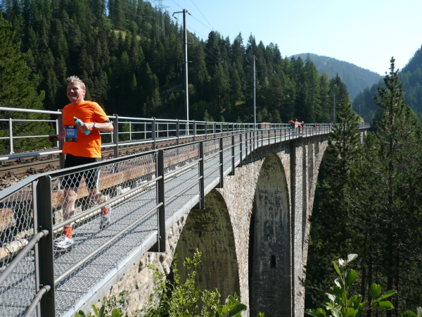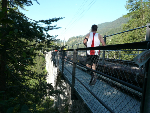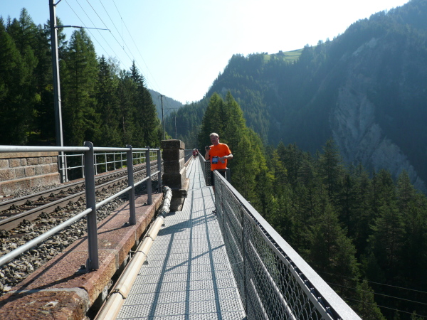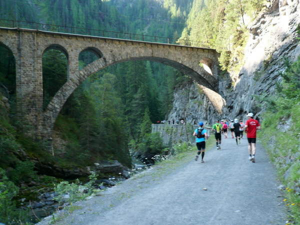 Birgit, die mit ihrem Norbert ebenfalls hier ist und auch mit uns in der Schatzalp wohnt, hole ich (erst) hier ein, ich bin doch ziemlich weit hinten gestartet. Wie lange werde ich heute benötigen? Das ist sehr schwer einzuschätzen, insbesondere bei den heutigen Bedingungen. Ausgehend von den Ergebnissen einiger Bekannter aus den vergangenen Jahren könnte ich mir so in etwa zehneinhalb Stunden vorstellen, dafür müsste ich allerdings die ersten 40 km bis Bergün in max. vier Stunden und zwanzig Minuten laufen können. Jetzt erfreuen uns aber erstmals Naturpfade, ich habe mich übrigens für Trailschuhe mit GoreTex entschieden, die mögen keinen Asphalt.