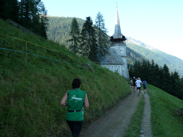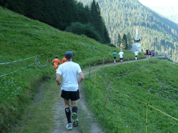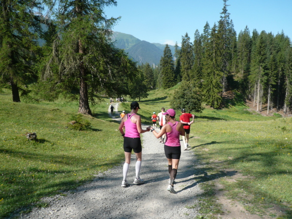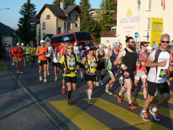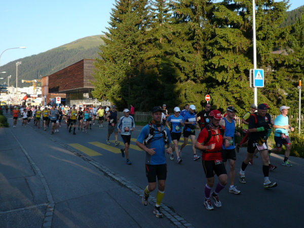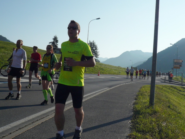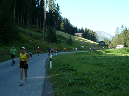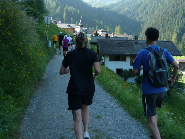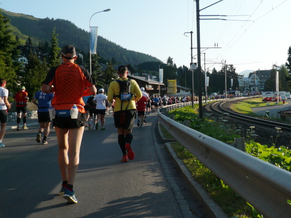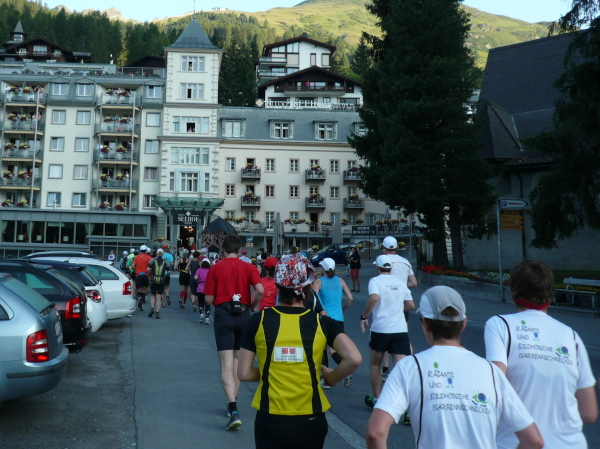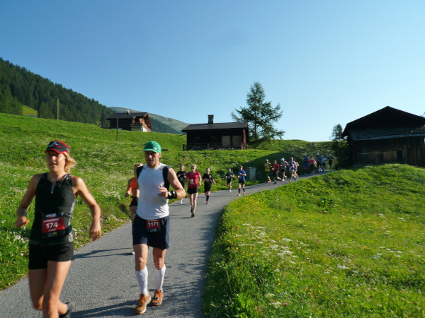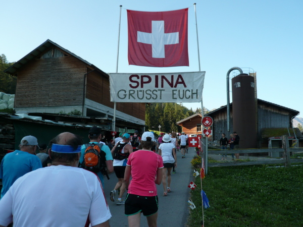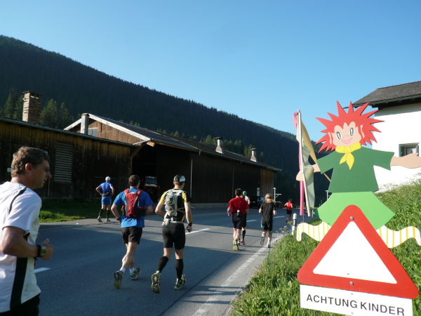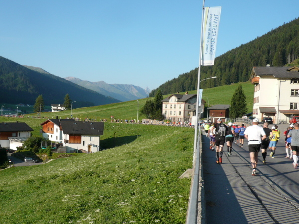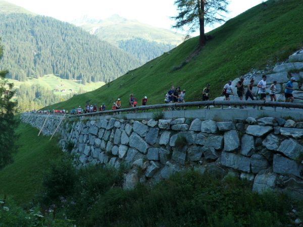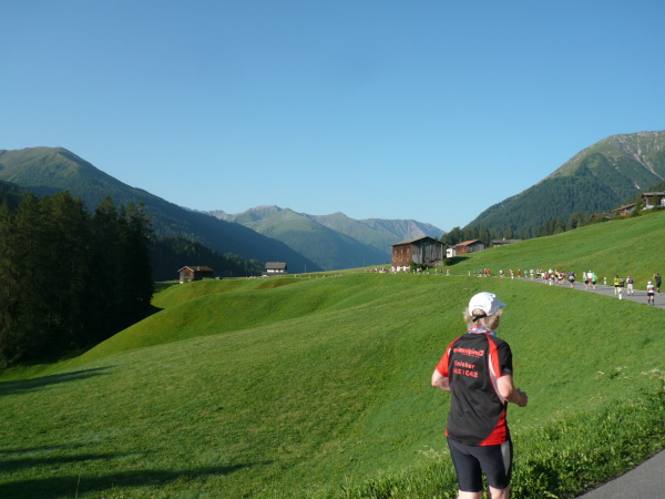 Brigitte Krämer unterhält mich am Dorfausgang und erzählt mir stolz, daß sie zweimal je 30 km von ihren beiden Söhnen begleitet werden wird, das ist doch eine feine Sache. Mit erstem Treichelgeläute verlassen wir Davos und laufen, noch etliche Zeit auf Asphalt, weiter ins Tal hinaus in Richtung Lengmatte. Die ersten Wellen nehmen wir noch locker, in weiser Voraussicht auf das Kommende wird aber auch schon mal das Gehen ausprobiert. Der Himmel ist blau, die Gegend schön, die Stimmung gut. So kommen wir nach 11 km ins Örtchen Spina, das uns mit großem Tamtam begrüßt, fast erinnert es mich ein wenig an Wengen beim Jungfrau-Marathon. Die erste größere Steigung bringt uns rund 150 m nach oben, noch begünstigt gnädiger Schatten das Vorwärtskommen.