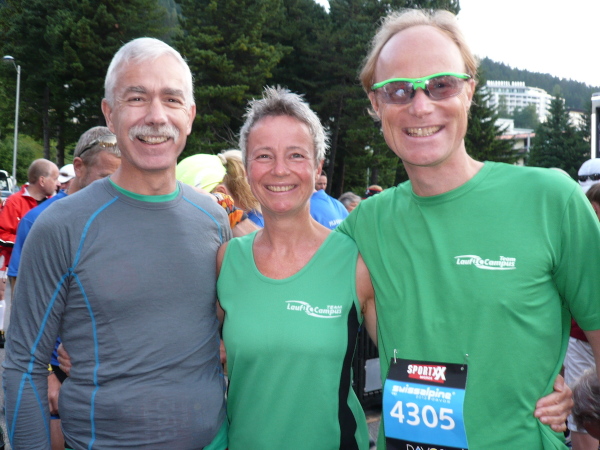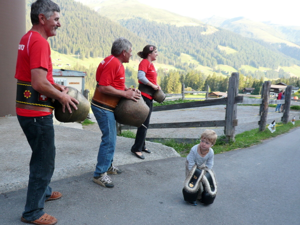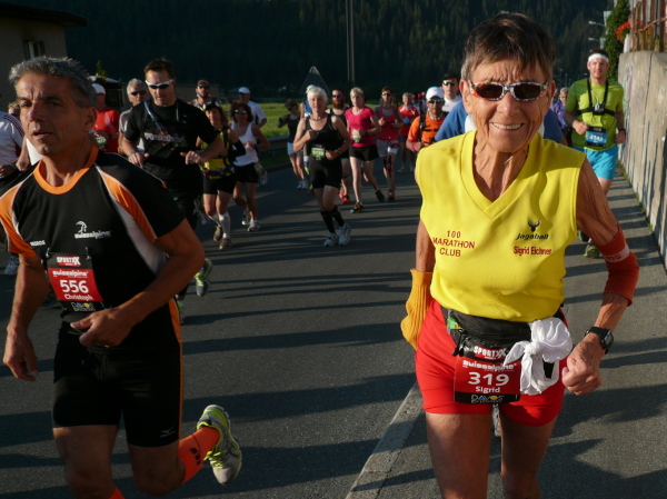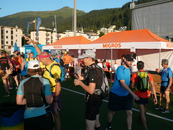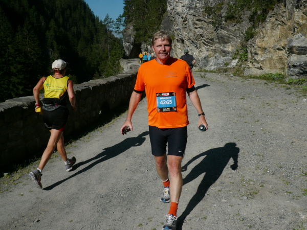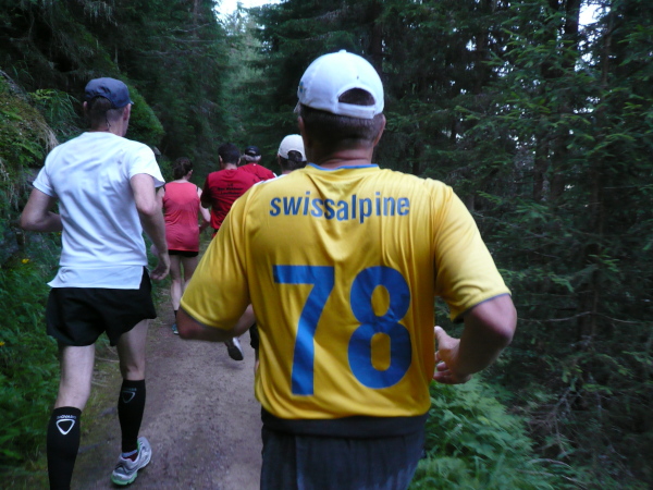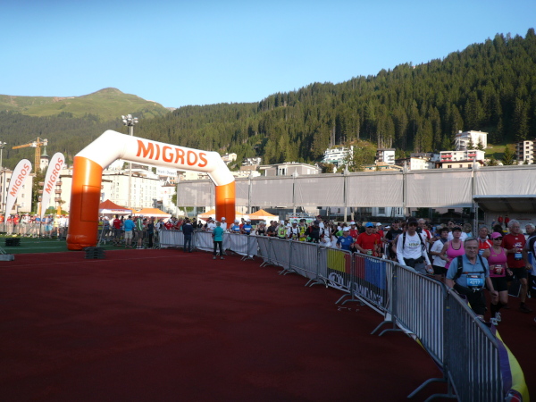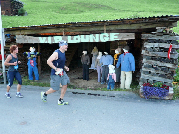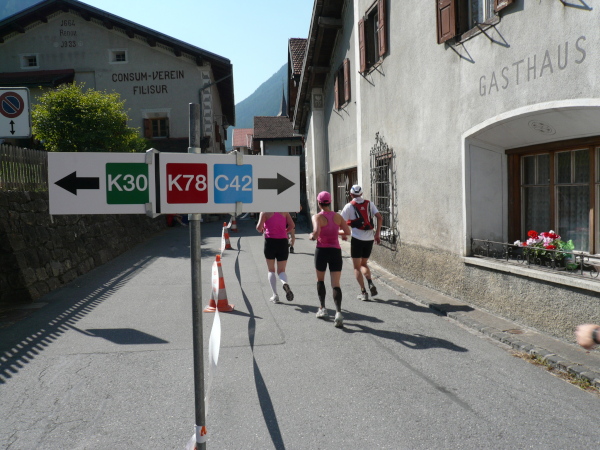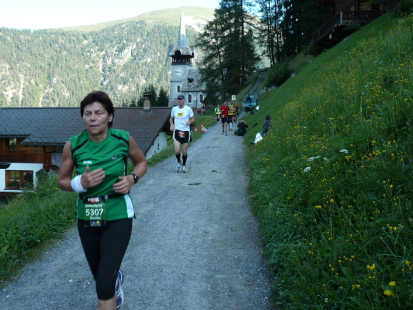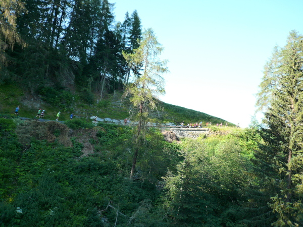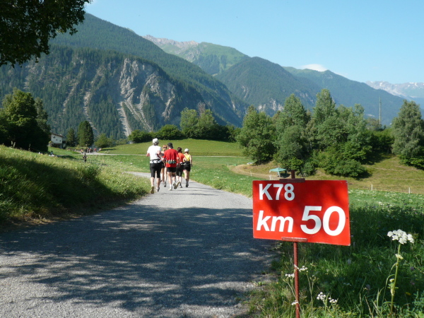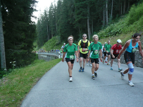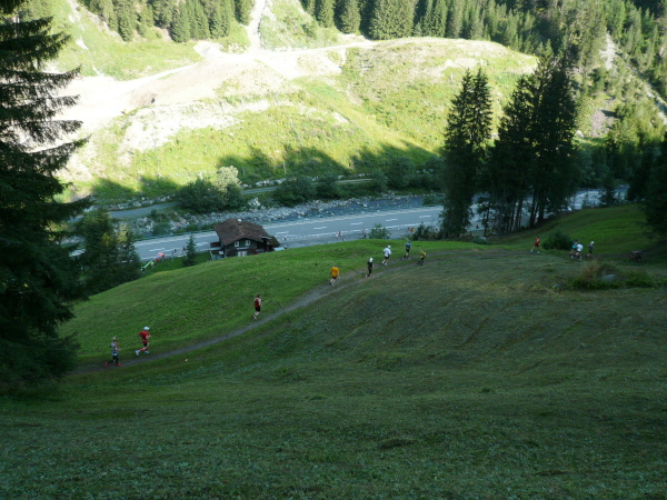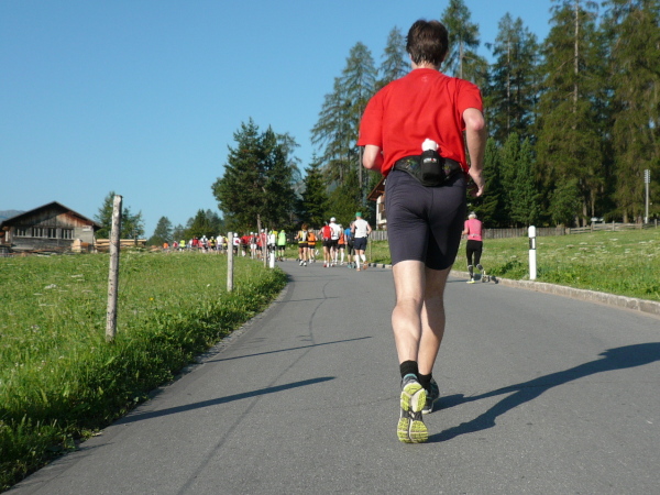 Brigitte Krämer unterhält mich am Dorfausgang und erzählt mir stolz, daß sie zweimal je 30 km von ihren beiden Söhnen begleitet werden wird, das ist doch eine feine Sache. Mit erstem Treichelgeläute verlassen wir Davos und laufen, noch etliche Zeit auf Asphalt, weiter ins Tal hinaus in Richtung Lengmatte. Die ersten Wellen nehmen wir noch locker, in weiser Voraussicht auf das Kommende wird aber auch schon mal das Gehen ausprobiert. Der Himmel ist blau, die Gegend schön, die Stimmung gut. So kommen wir nach 11 km ins Örtchen Spina, das uns mit großem Tamtam begrüßt, fast erinnert es mich ein wenig an Wengen beim Jungfrau-Marathon. Die erste größere Steigung bringt uns rund 150 m nach oben, noch begünstigt gnädiger Schatten das Vorwärtskommen.