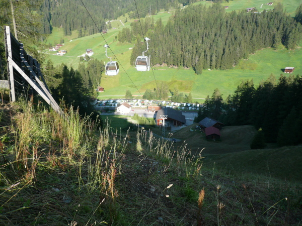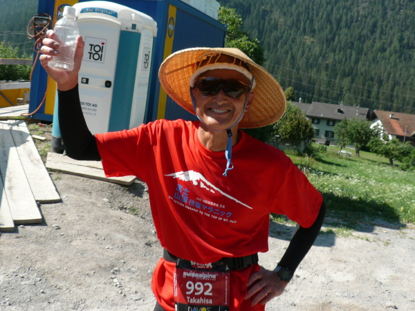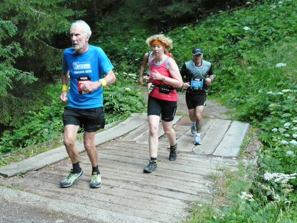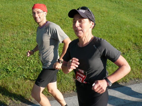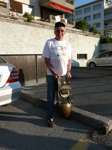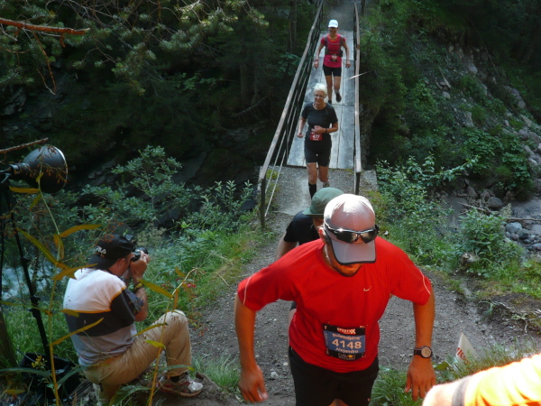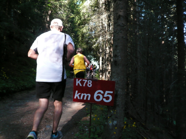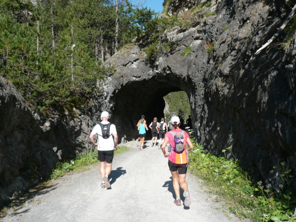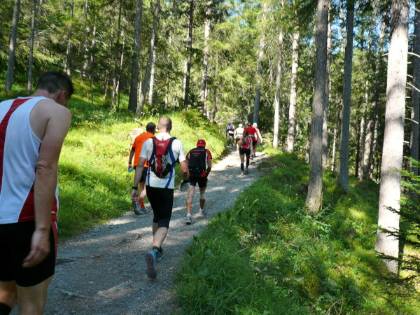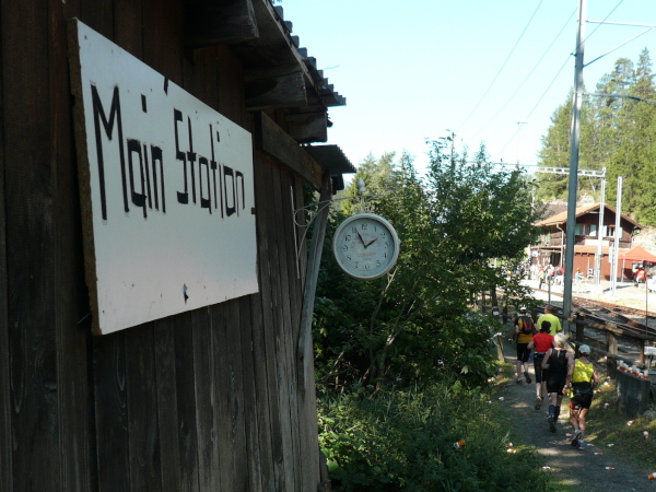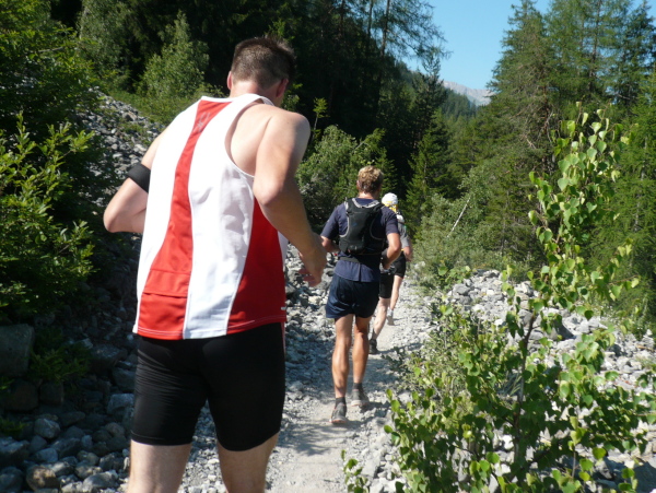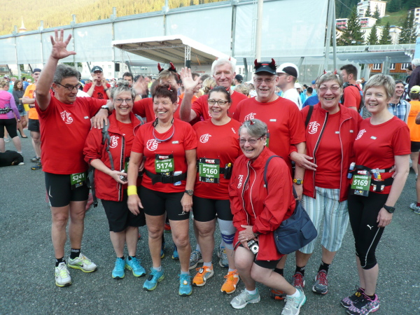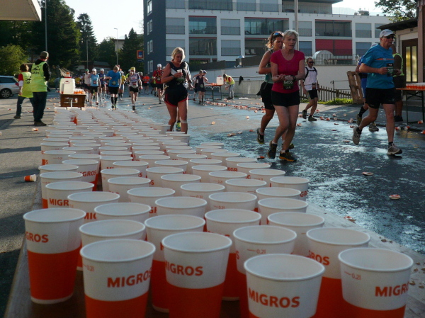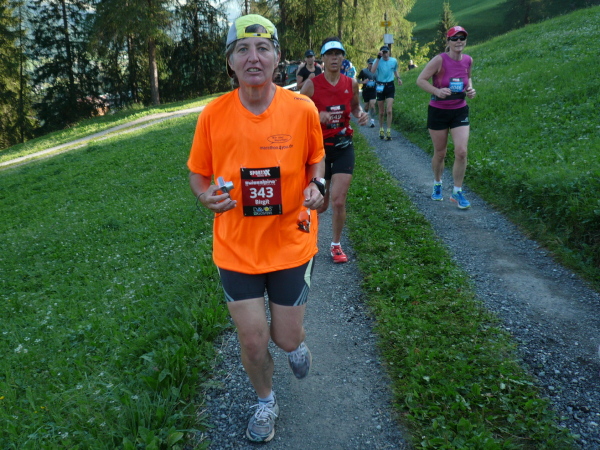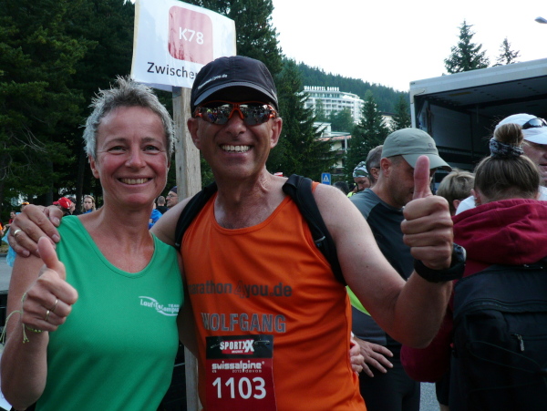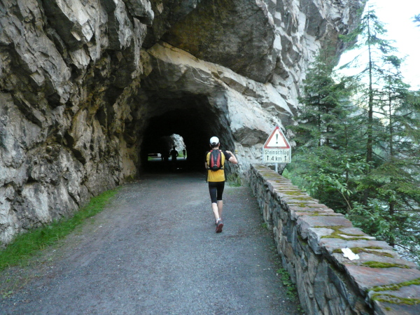 Brigitte Krämer unterhält mich am Dorfausgang und erzählt mir stolz, daß sie zweimal je 30 km von ihren beiden Söhnen begleitet werden wird, das ist doch eine feine Sache. Mit erstem Treichelgeläute verlassen wir Davos und laufen, noch etliche Zeit auf Asphalt, weiter ins Tal hinaus in Richtung Lengmatte. Die ersten Wellen nehmen wir noch locker, in weiser Voraussicht auf das Kommende wird aber auch schon mal das Gehen ausprobiert. Der Himmel ist blau, die Gegend schön, die Stimmung gut. So kommen wir nach 11 km ins Örtchen Spina, das uns mit großem Tamtam begrüßt, fast erinnert es mich ein wenig an Wengen beim Jungfrau-Marathon. Die erste größere Steigung bringt uns rund 150 m nach oben, noch begünstigt gnädiger Schatten das Vorwärtskommen.