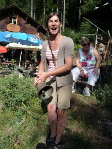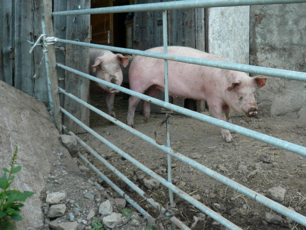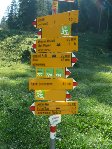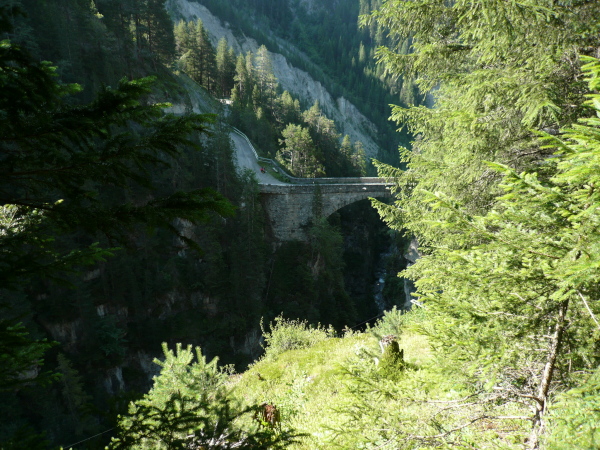 In Rotschtobel begeistern mich ein paar Schweine, die ich zum Entsetzen einiger auf der anderen Straßenseite stehender weiblicher Fans ablichte. „Ja, Mädels, ich mußte mich entscheiden, wer schöner ist: Die Schweine oder ihr!“ Glücklicherweise können sie über meine Frechheit herzlich lachen. Hier haben wir den vorerst höchsten Punkt erreicht und kommen, zunächst wieder auf festem Weg, über Monstein ins Tal. Auf den nächsten 14 km werden wir fast 700 Höhenmeter verlieren.