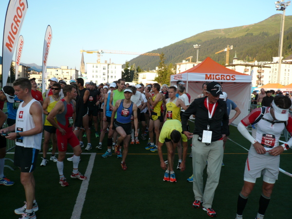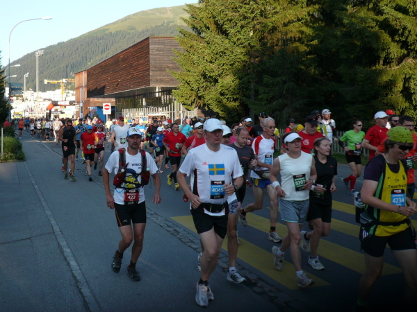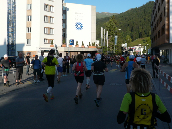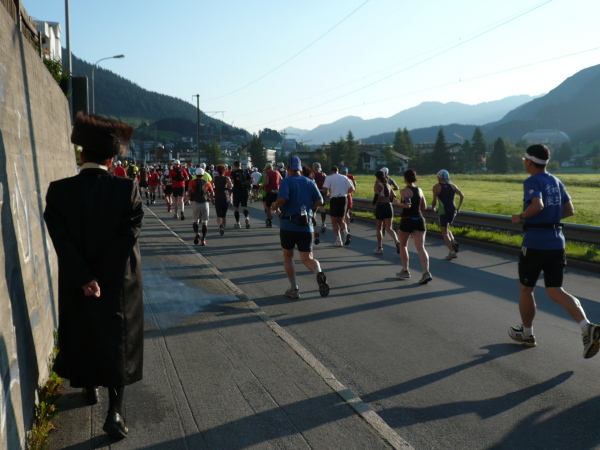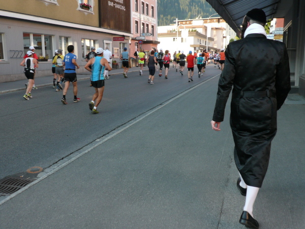 Aus dem Stadion heraus geht es auf einer großen Runde durch Davos Dorf und Platz, gemeinsam mit uns sind auch die Teilnehmer des C42 und K30 gestartet. Auffällig viele Fans sind zu dieser frühen Stunde schon am Straßenrand und verabschieden uns mit guten Wünschen. Ausdrücklich ausgenommen davon sind wohl die orthodoxen Juden, die sich in großer Zahl von jung bis alt in der Stadt aufhalten und vermutlich nicht nur mir auffallen. Sie streben im Kaftan (schwarzer Mantel) und mit Streimel (Fellhut) auf dem Kopf zur Synagoge, schließlich ist heute Sabbat, den wir in ihren Augen sicherlich schänden. Dieses Bild muß zu vergangenen Zeiten in vielen deutschen und europäischen Städten zum normalen Straßenbild gehört haben, für mich ist es völlig ungewohnt.