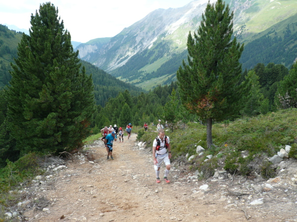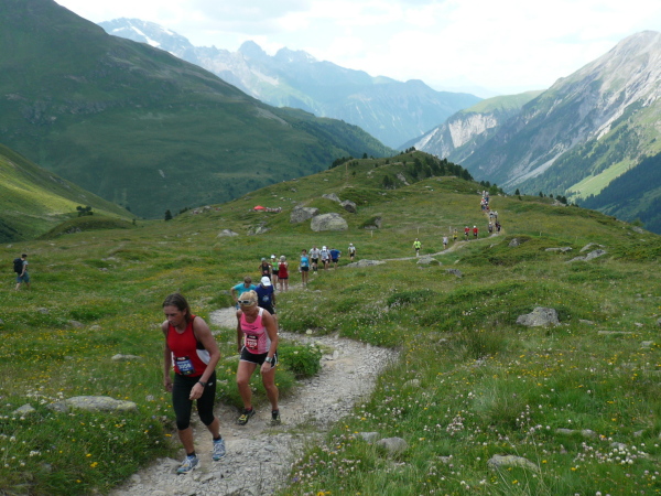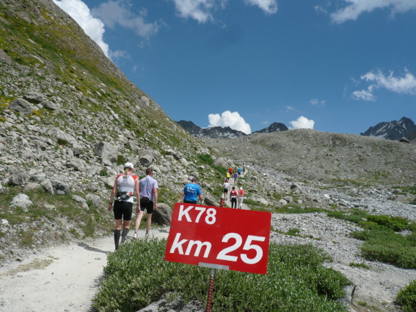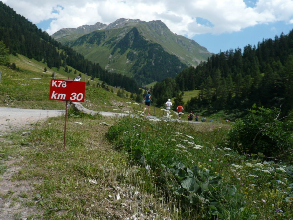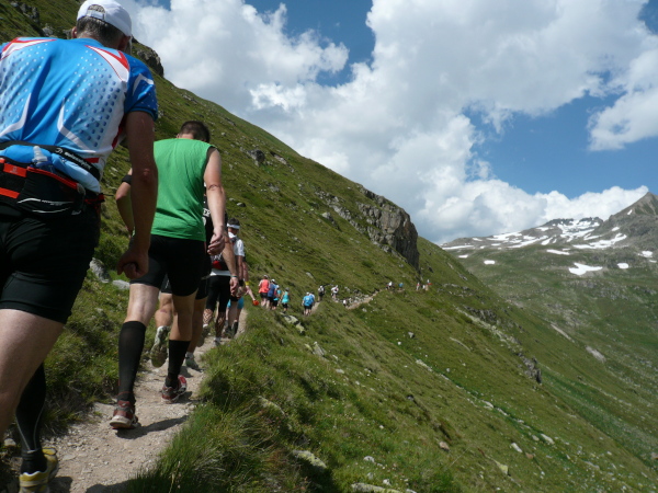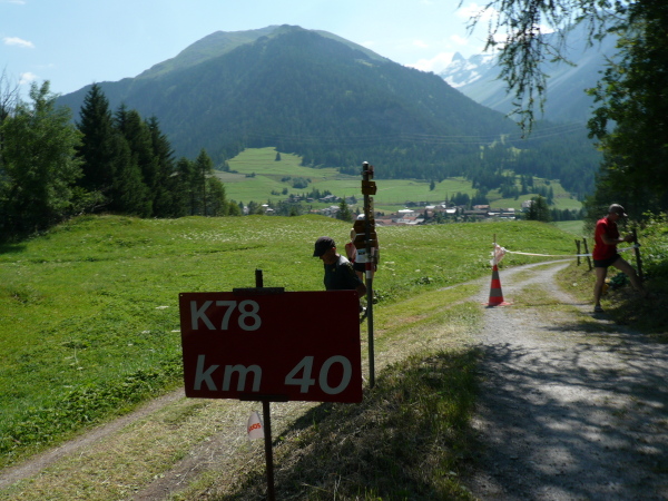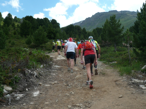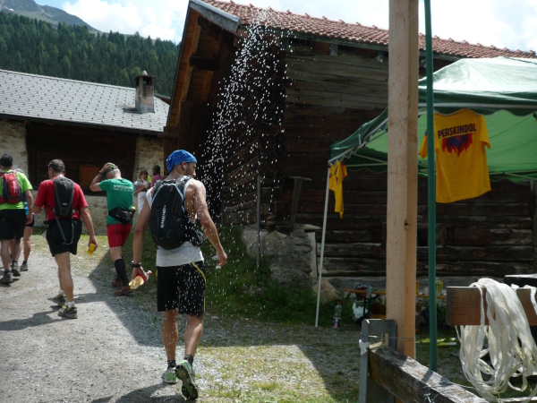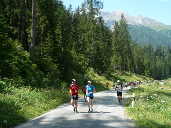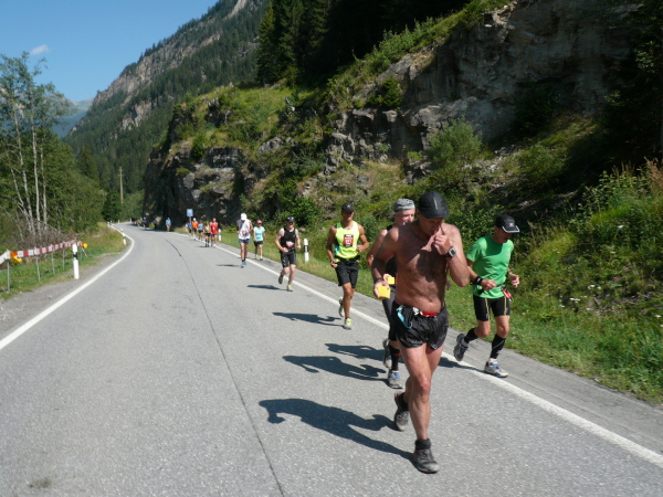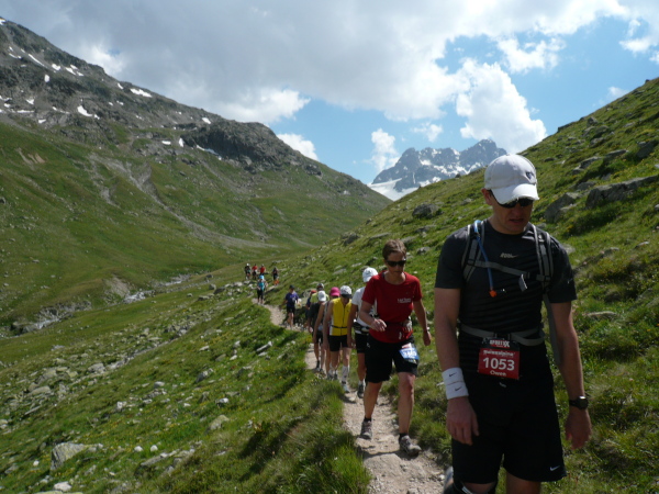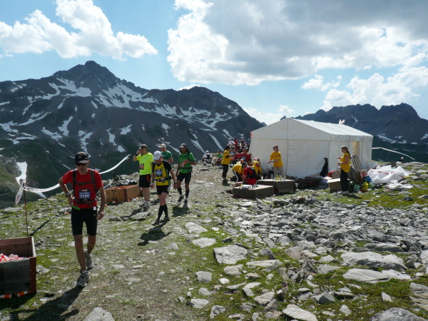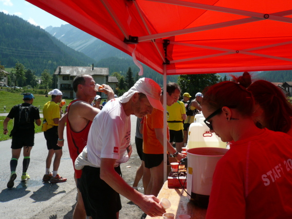 Die Bilder des Elends häufen sich: An den Verpflegungsstellen, immer wieder auch unterwegs, haben sich Läufer niedergelassen und versuchen, so wieder zu Kräften zu kommen. Dabei sollte es erst jetzt richtig losgehen. Am Berghaus Pitz Kesch sind wir auf 1.825 m aufgestiegen, fast 500 m seit Bergün. Der Massagedienst hat, wie überall, Hochkonjunktur, ich entsage ihm, bleibe sicherheitshalber lieber in Bewegung und setze mich zwischendurch auch nicht hin. Zu groß erscheint mir die Gefahr, nicht mehr in die Puschen zu kommen. Dann, bei km 50, geht’s endgültig ans Eingemachte.