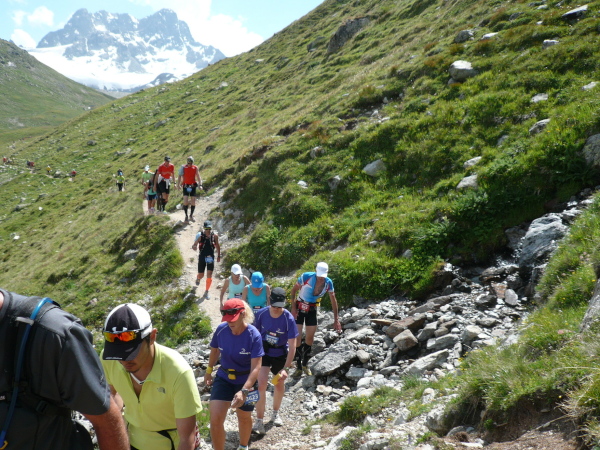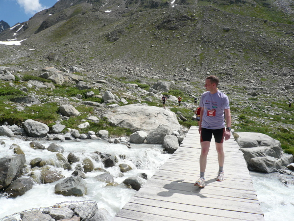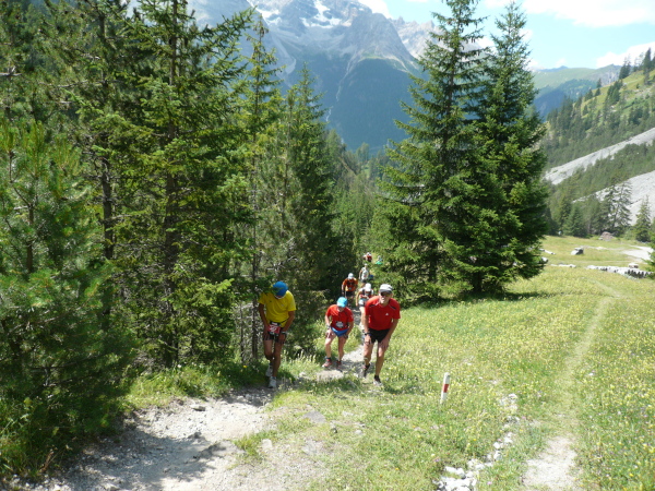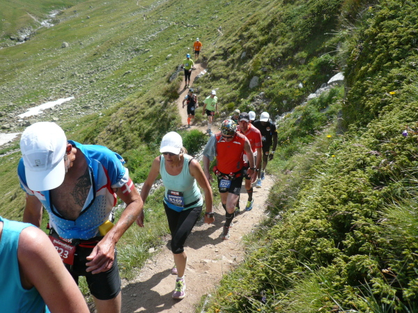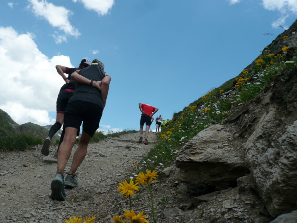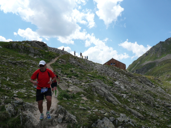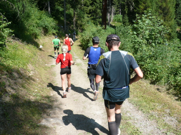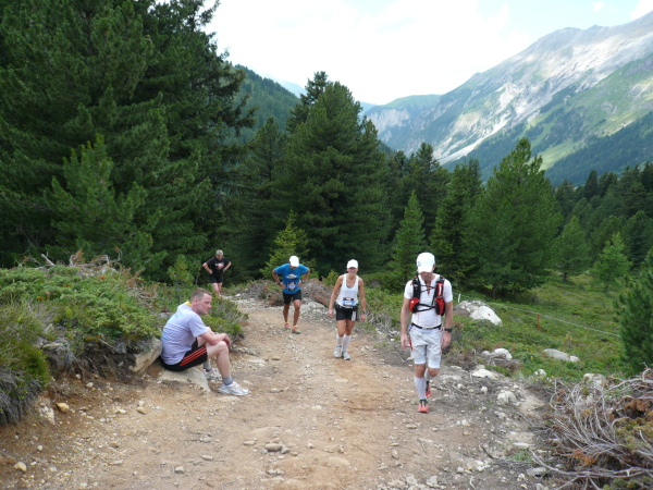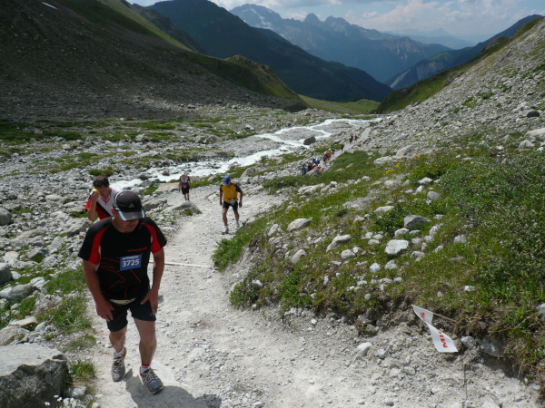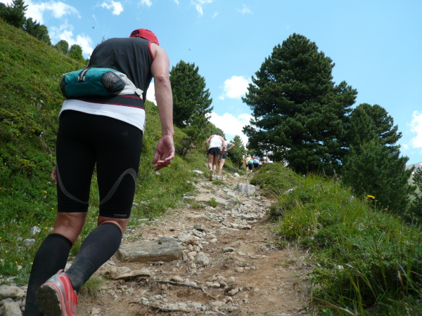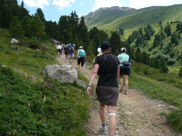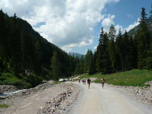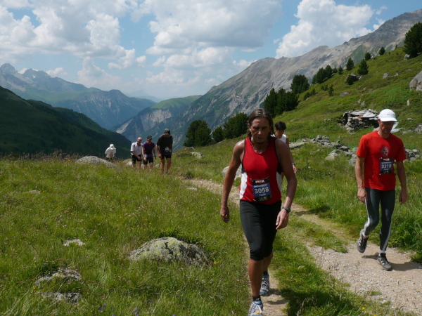 Die Bilder des Elends häufen sich: An den Verpflegungsstellen, immer wieder auch unterwegs, haben sich Läufer niedergelassen und versuchen, so wieder zu Kräften zu kommen. Dabei sollte es erst jetzt richtig losgehen. Am Berghaus Pitz Kesch sind wir auf 1.825 m aufgestiegen, fast 500 m seit Bergün. Der Massagedienst hat, wie überall, Hochkonjunktur, ich entsage ihm, bleibe sicherheitshalber lieber in Bewegung und setze mich zwischendurch auch nicht hin. Zu groß erscheint mir die Gefahr, nicht mehr in die Puschen zu kommen. Dann, bei km 50, geht’s endgültig ans Eingemachte.
