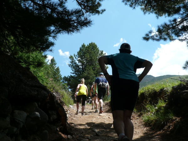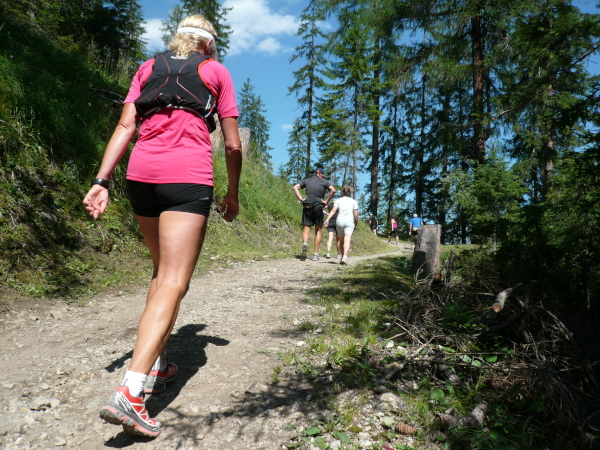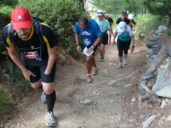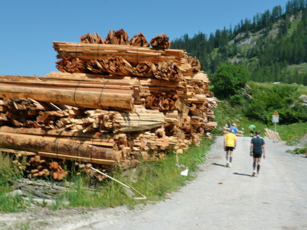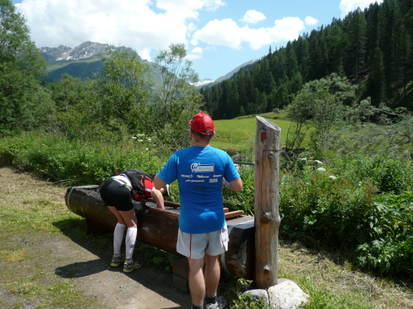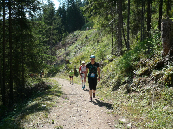 Gute 300 m wird es auf den folgenden 11 km wieder aufwärts gehen, und „Gehen“ ist auch für uns das Stichwort, denn wiederum sparen wir uns auf etlichen Abschnitten einige Körner. Richtig heiß und staubig ist es mittlerweile auf den breiten Schotterpisten geworden, dagegen angenehm kühl, aber steil im Wald. Meine mit Iso gefüllte Flasche habe ich zur Hälfte geleert und lasse sie mit Wasser wieder auffüllen. Es gibt mir ein gutes Gefühl, immer eine Reserve dabeizuhaben, trotz der hohen Trankstellendichte nutze ich sie ausgiebig.