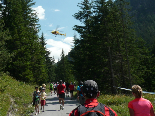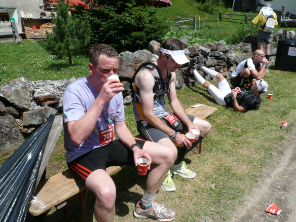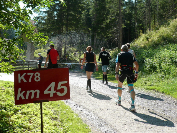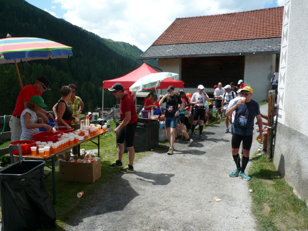 Von den zehneinhalb Stunden habe ich mich ja schon lange verabschiedet, jetzt ist nur noch Ankommen in Würde angesagt, Herausforderung genug! Laufzeiten werden ohnehin völlig überbewertet. Der Kollege neben mir nutzt sein iPhone als Diktiergerät: „Km 50, bin jetzt schon völlig platt. Wie soll ich den Rest überstehen?“ Doch 700 weitere Höhenmeter stehen auf den folgenden vier km an, der Weg erinnert mich fatal an die Jungfrau vor der Moräne. Mit schweren Schritten auf unebenem Untergrund wuchte ich mich Meter für Meter nach oben, keine Besserung in Sicht. Schweigen im Walde, alles ist verstummt und nur noch mit sich selbst beschäftigt. Die Kühe schauen sich das Ganze verständnislos wiederkäuend an. Die nächste Versorgungsstation gleicht einem Feldlazarett, schaut Euch die Fotos an, sie sprechen für sich.