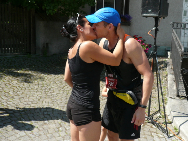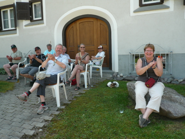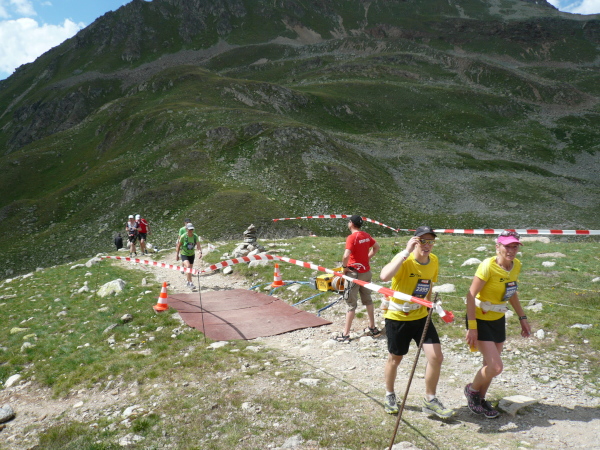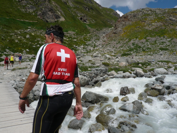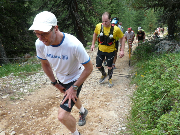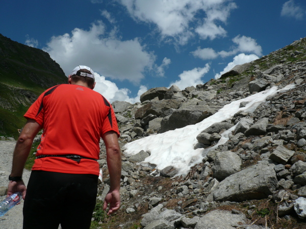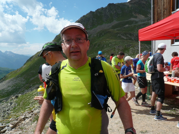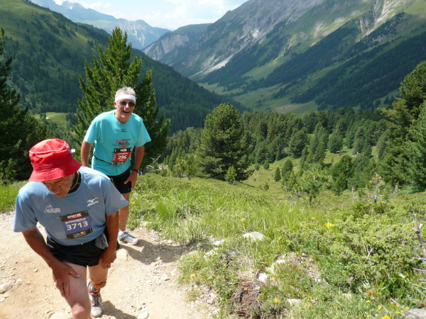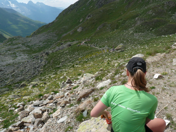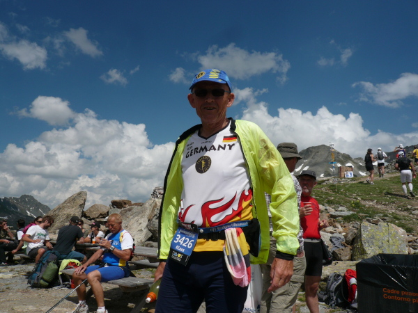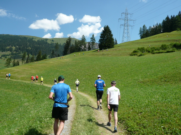 Hier werde ich, wie schon in Bergün, namentlich begrüßt und stoße auf Andreas Zamperoni, der mit uns in der Schatzalp logiert, und auch schon frischer aussah. „Schau mal freundlich, Keule!“. Weltenbummler Klaus Neumann tut sich und mir den Gefallen, ein kleines Schwätzchen muß jetzt sein. Er ist heute auf dem K42 unterwegs. Wenn man jetzt keinen Sport treiben müßte, würde ich mich in die Sonne legen. Sagenhafte 20° sind es hier auf der Höhe! Dann hilft nichts mehr, es muß weitergehen.
