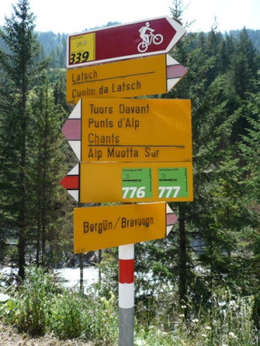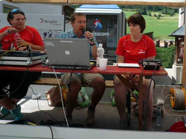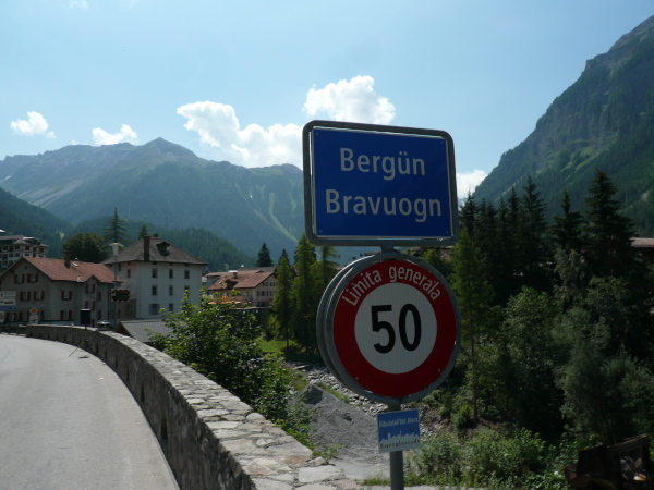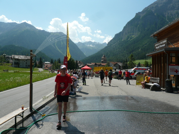 Die letzten drei km vor Bergün fallen erneut steil ab. Kurz vor dem Ort werden die C42er noch auf eine kleine Zusatzschleife geschickt, bevor sie im Dorf ihren wohlverdienten Zieleinlauf genießen dürfen. Es ist kurz nach 11 Uhr, als ich an der letzten Tränke erfahre, daß es hier auf rund 1.350 m bereits 31° heiß ist!