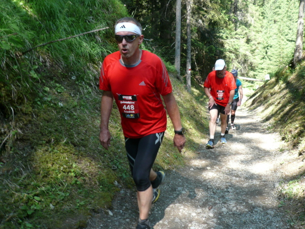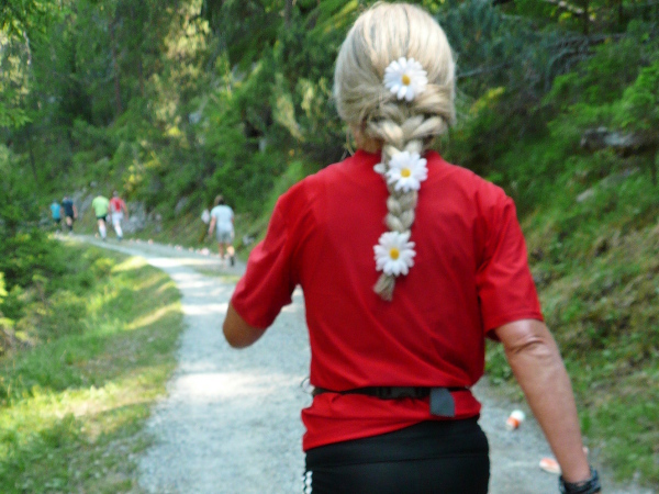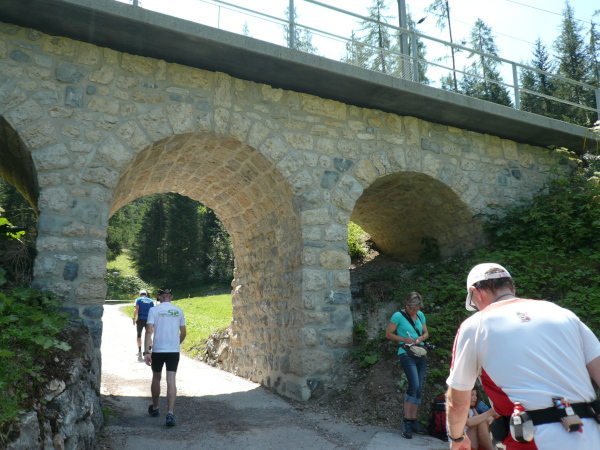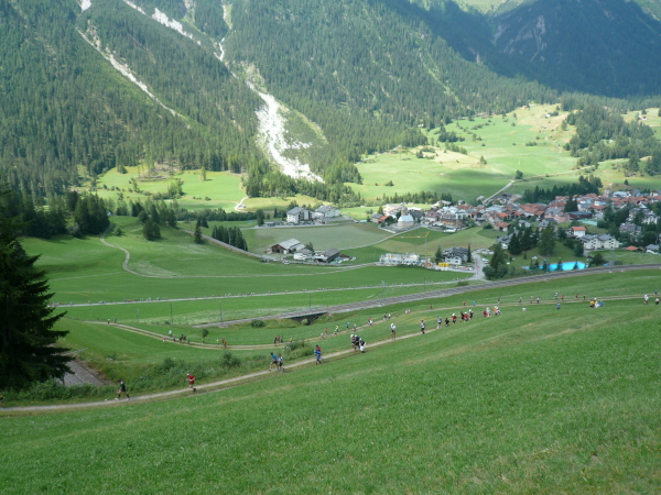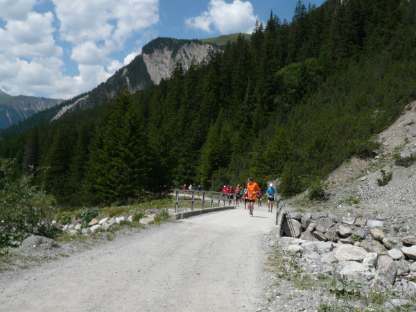 Tja, nach bisherigen gelaufenen knappen viereinhalb Stunden ist mir klar, daß das mit den avisierten zehneinhalb Stunden auf keinen Fall mehr etwas geben wird. Na gut, dann dauert es halt etwas länger, Ankommen zählt. Oh, ich Ahnungsloser! Besonders brutal ist es, am Bergüner Freibad vorbeizulaufen, das „Springe doch hinein!“ zu rufen scheint. Wie gerne wäre ich dieser eingebildeten Aufforderung gefolgt. In weiten Serpentinen windet sich der Weg hinauf, ab jetzt geht es eigentlich erst wirklich los. Was mich im künftigen Verlauf echt demoralisiert, ist das ständige Überholtwerden. Zwar sind es zumeist die K42er, die zunächst eine Schleife laufen mußten, bevor sie auf den K78er Kurs durften, aber es irritiert und frustriert trotzdem.