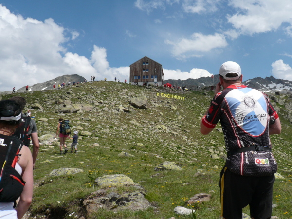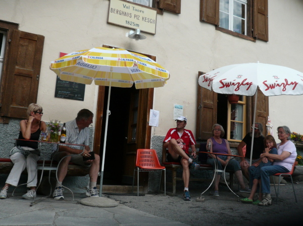 Die Keschhütte auf 2.632 m ist beispielgebend: Im Jahr 2000 vollständig neu gebaut, nutzt sie die Sonne für die Energieversorgung der Hütte und bekam deshalb den Schweizer Solarpreis für besonders umweltfreundliches Bauen. Die Sonnenkollektoren (für Warmwasser) und die Solarzellen (für die Stromproduktion) werden durch ein kleines Wasserkraftwerk unterhalb der Hütte und seit Sommer 2011 zusätzlich durch zwei Windgeneratoren unterstützt. Das alles aber interessiert mich augenblicklich herzlich wenig, ich will nur Atzung, diese vier km Aufstieg haben mich geschafft.