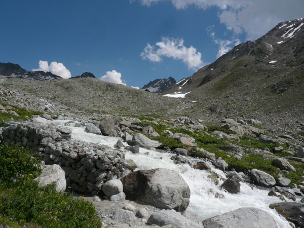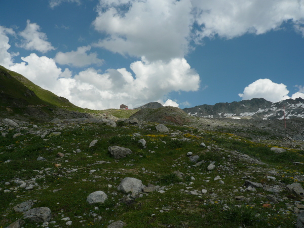 Und weiter zieht die Karawane, erste kleinere Schneefelder tauchen auf. Allerdings nicht vergleichbar mit der Zugspitze vor drei Wochen, schließlich liegt durchgehender Hochsommer zwischen beiden Ereignissen. Dafür rauschen Gebirgsbäche mit Schmelzwasser die Hänge herab, immer wieder müssen wir sie auf kleinen Stegen oder über dicke Steine oder sonst wie überqueren. Klarer Fall: Auch hier labt sich das dürstende und schwitzende Volk. Wir nähern uns der Vegetationsgrenze, Bäume hat’s schon lange keine mehr. Und immer weiter geht es hinauf. Dann hebt sich ein Holzgebäude auf einem Grat scharf gegen den Himmel ab, nach weiteren schweißtreibenden Metern haben wir sie dann erreicht.