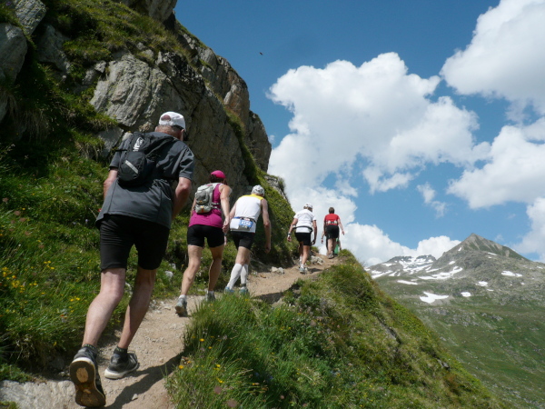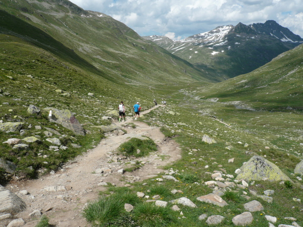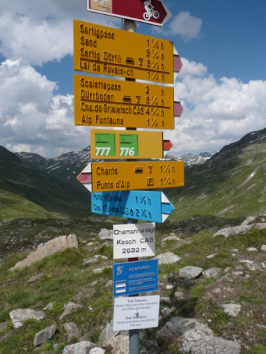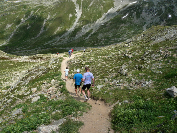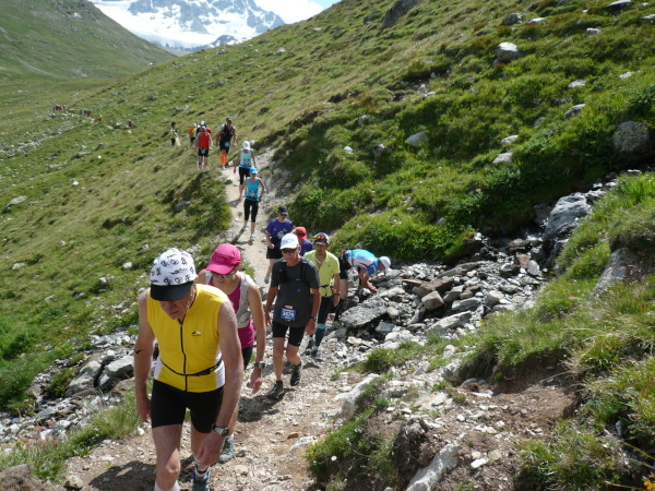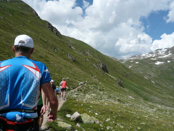 Zwischen der Keschhütte als erstem markanten „Höhepunkt“ und dem zweiten, dem Sertig(s)paß, liegt eine ordentliche Senke, fast 250 HM verlieren wir auf den ersten beiden km. Und schwierig wird’s, der enge Pfad („Panoramatrail“) erschwert ein Überholen enorm, glücklicherweise ist das nicht mein Problem. Beeindruckende Aussichten öffnen sich uns, schade, daß man so sehr auf den Weg achten muß, eigentlich müßte man nur staunen und genießen. Wann hat man mal solch ein geiles Wetter auf dieser Höhe? Das Ganze bei Regen, Schnee und Hagel ist bestimmt alles andere als lustig. Und lausig kalt dazu.