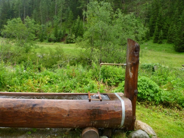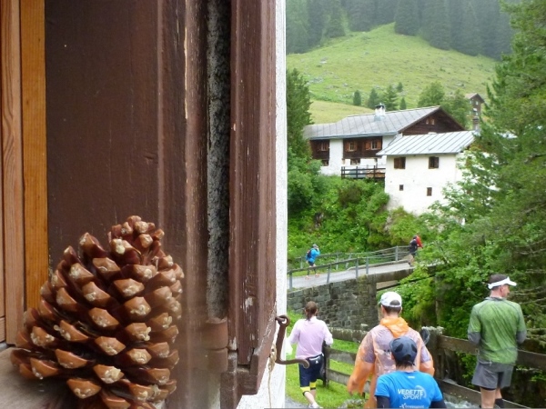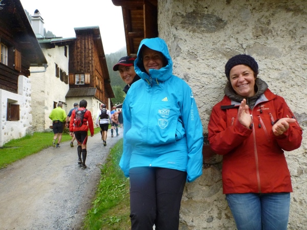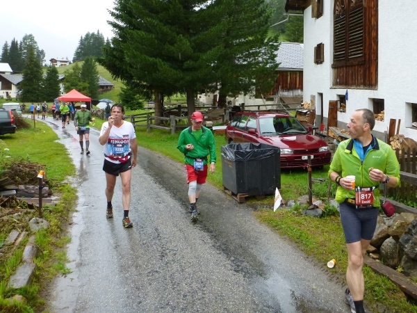 Im Weiler Tour Davant befinden wir uns bereits auf 1704 Meter. Elf Kilometer liegen hinter uns. Hier können wir bereits zum dritten Mal aus dem Vollem schöpfen. Beim Berglauf ist es ganz anders. Jeder lässt sich Zeit mit Essen und Trinken, einige lassen sich gar ihre Flaschen auffüllen. Ich brauche zwei bis drei Minuten, bis ich meine Grundbedürfnisse erfüllt habe und dann laufe ich weiter.