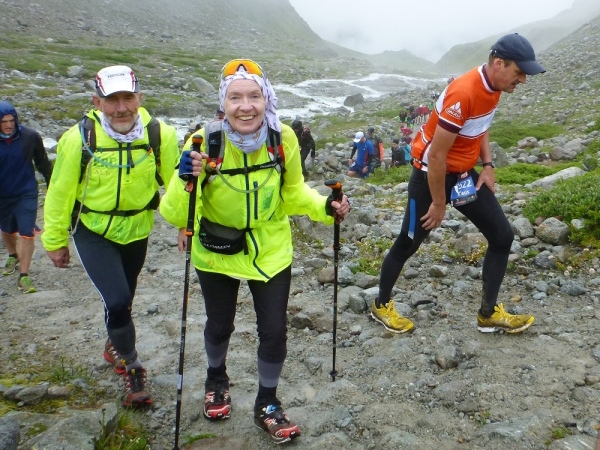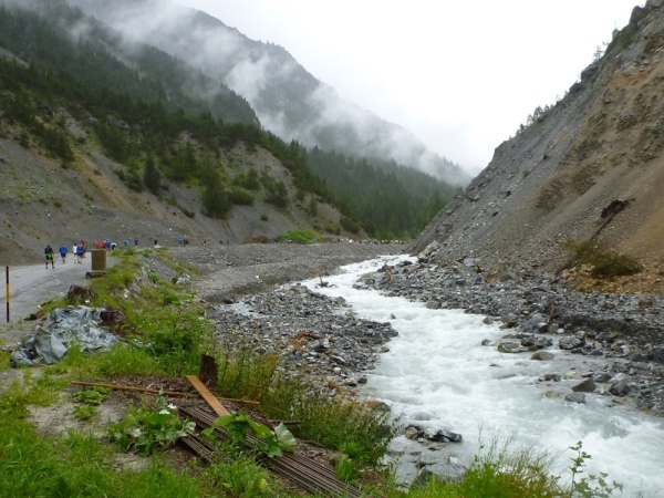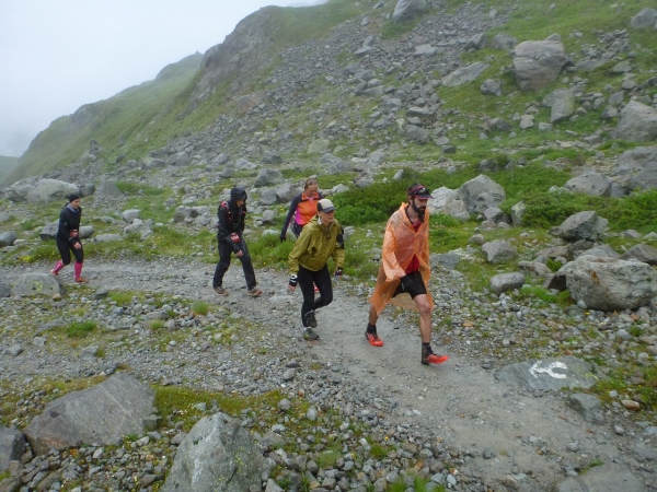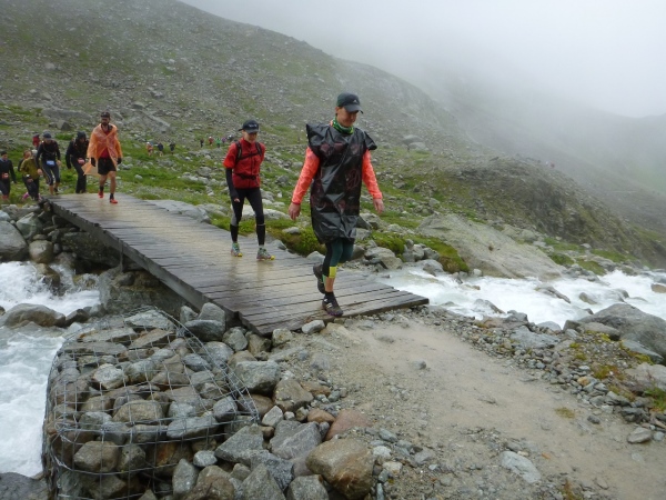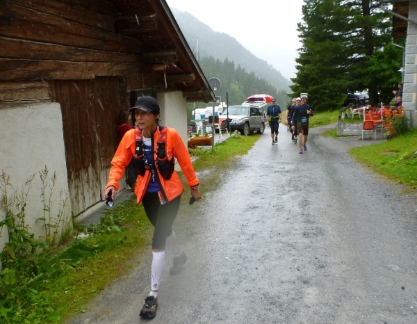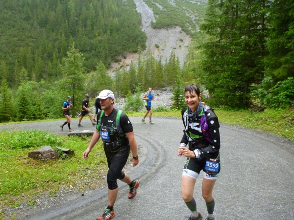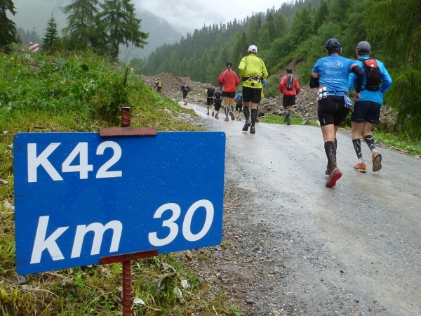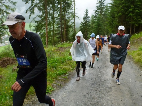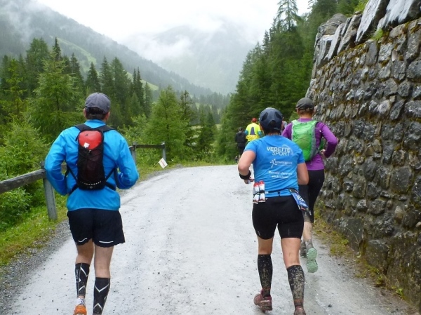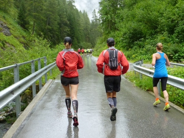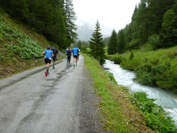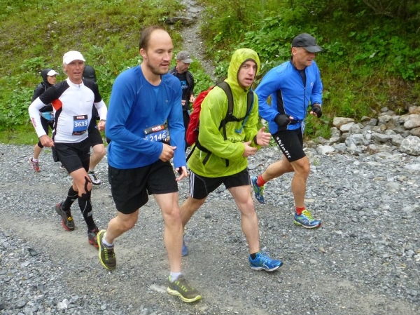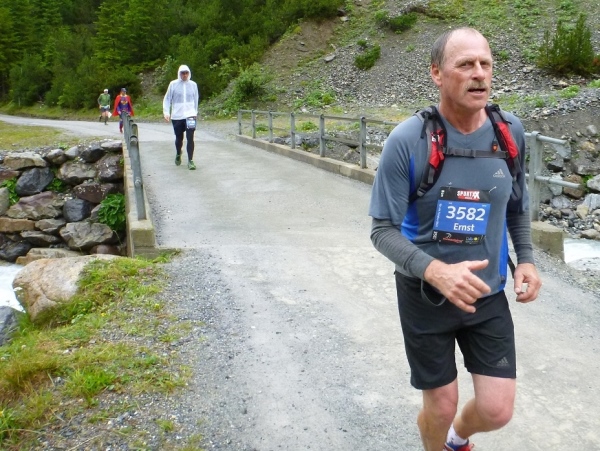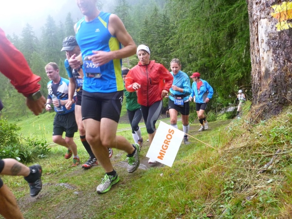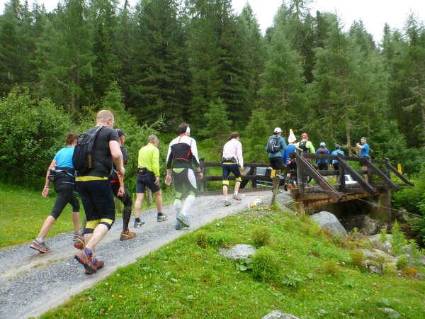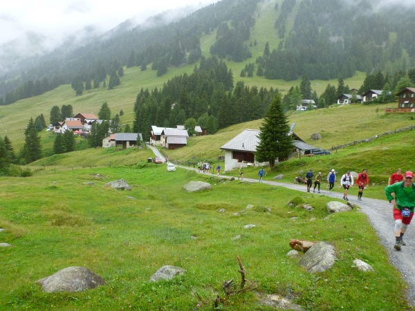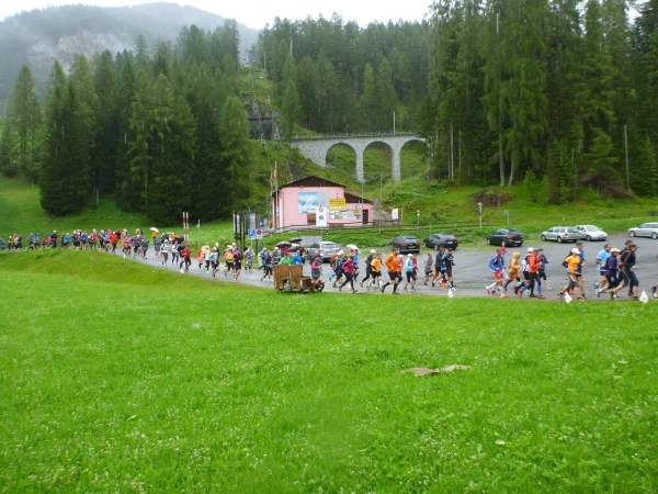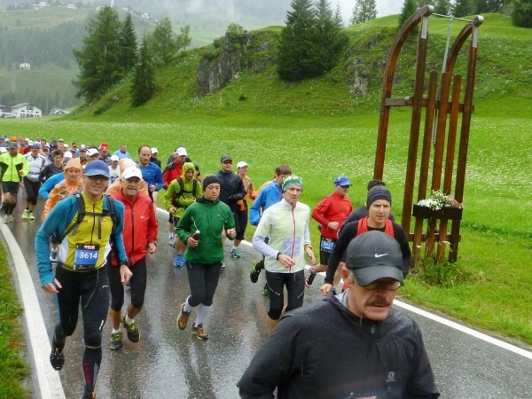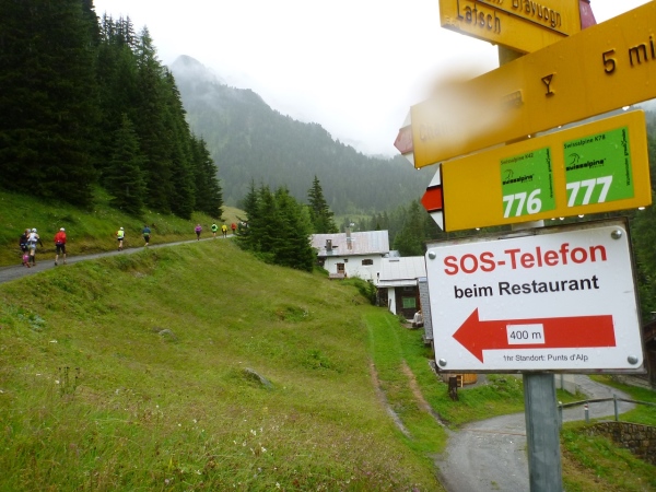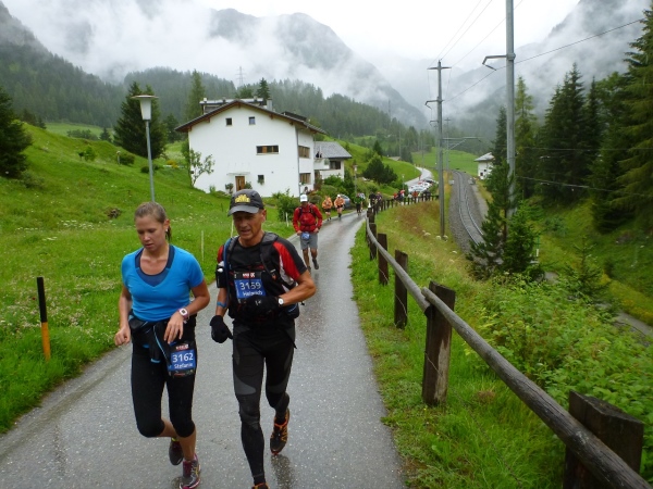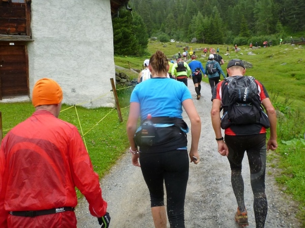Zuerst ist die Steigung noch moderat auf einem breiten Bergweg, doch die meisten Läufer sind inzwischen zum Wanderer geworden. Ich kann zwar auch nicht mehr alles laufen, aber jetzt am Berg will ich meine Stärke ausnutzen. Die Bergabläufer werden dann jenseits der Keschhütte und nach dem Sertigpass an mir vorbei springen. Die Versorgungsstationen kommen jetzt fast jeden Kilometer. Valzana und Tschüvel sind die nächsten beiden. Es ist nicht alles im Angebot, aber Bananen und Isogetränke reichen hier vollends.