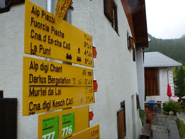 In Chants greife ich an der Tankstelle wieder zu. Die Bouillon wird heute mein Geschmacksfavorit, sie ist nämlich warm und sorgt für eine gute Mineralienzufuhr. Ein Wegweiser zeigt für die Keschhütte (Chamanna digl Kesch) 2 ¾ Stunden an. Ich bin gespannt, wie lange ich brauche für die rund 800 Höhenmeter und fünf Kilometer.