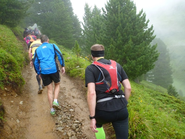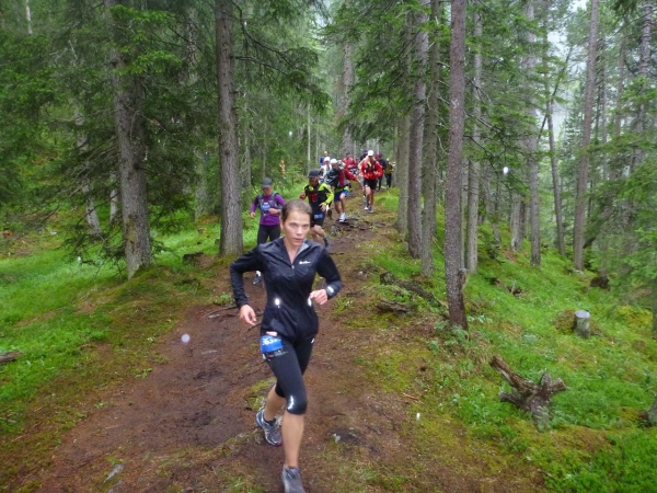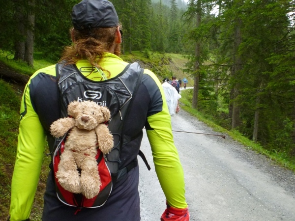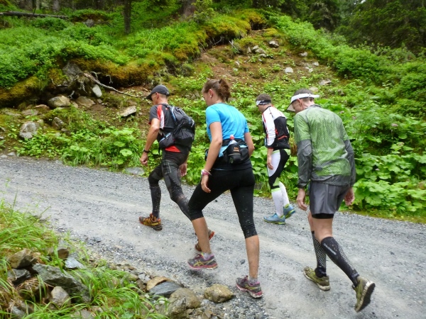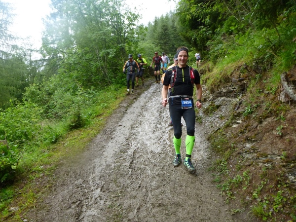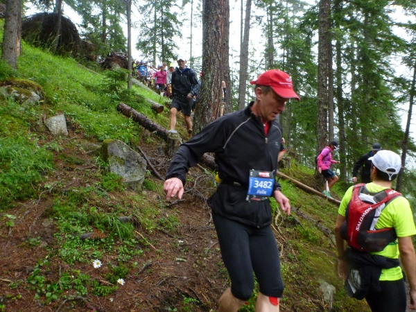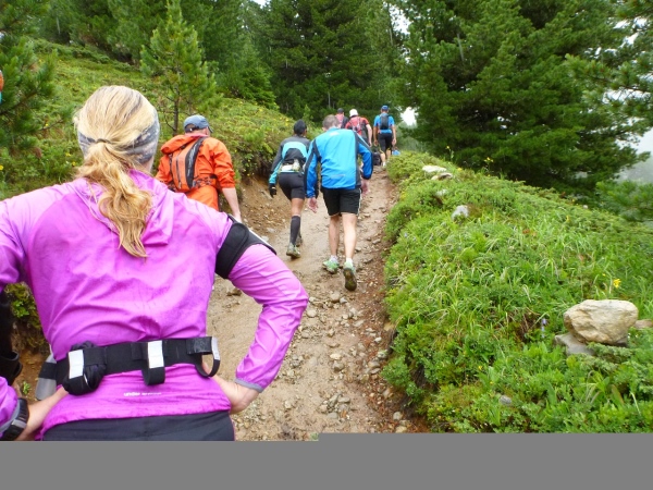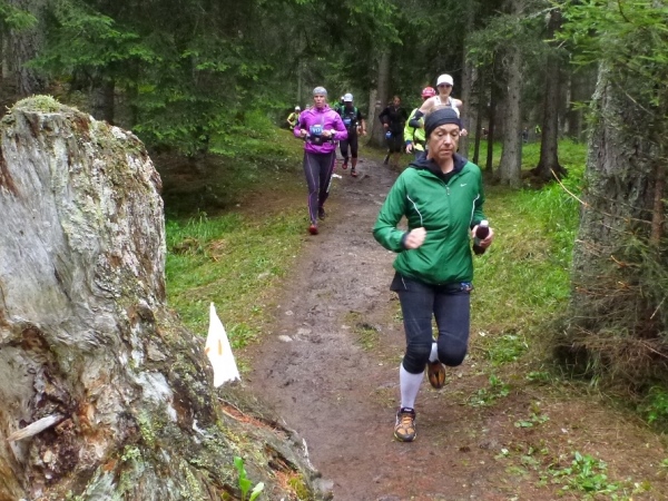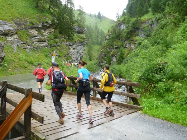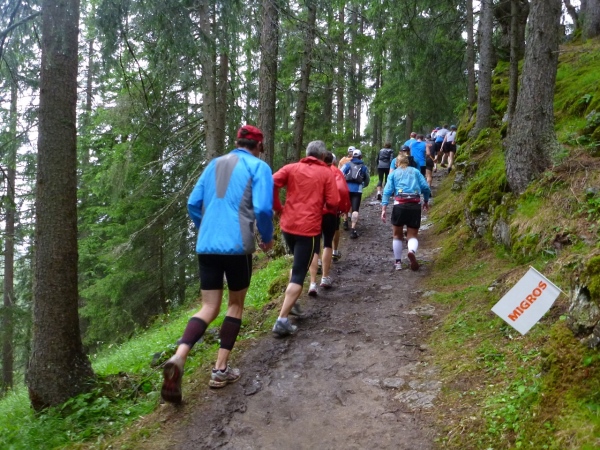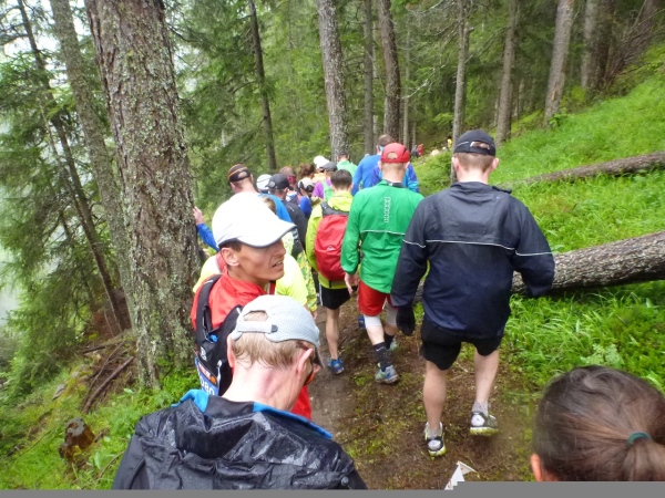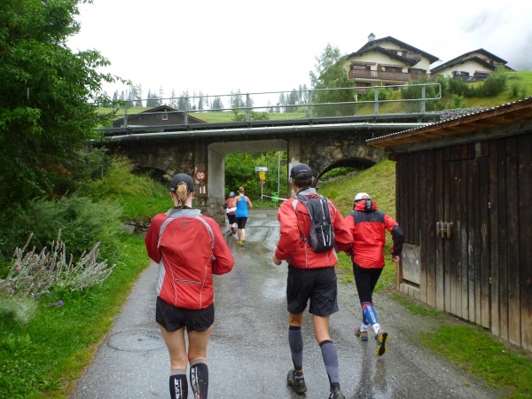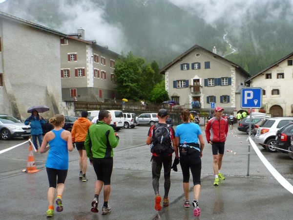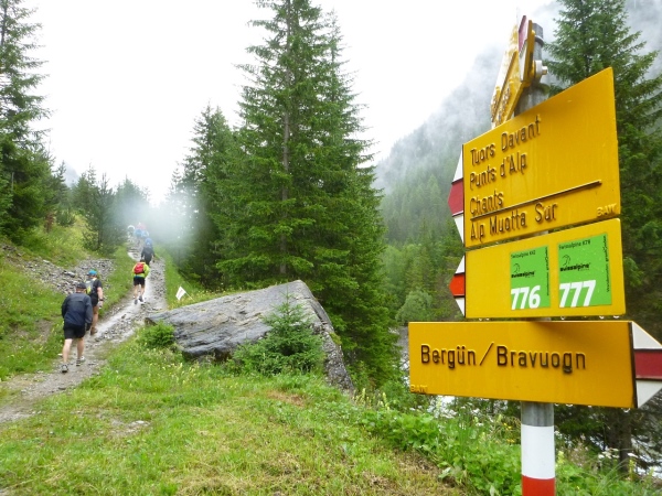 Die gewonnenen Höhenmeter verlieren wir auf einem tiefen Singletrail, wieder Stau. Einige versuchen, durch die „Botanik“ abzukürzen, sind aber auch nicht schneller. Der Trail mündet dann in einen breiten Waldweg ein, auf dem einige andere Läufer des Weges kommen. Erst auf dem zweiten Blick erkenne ich, dass wir auf den Kurs des K78 gestoßen sind. Ein längeres Gefälle bringt uns nach Bergün. Die Auftaktschleife ist nun geschafft. Und ein paar Kilometer auch.
