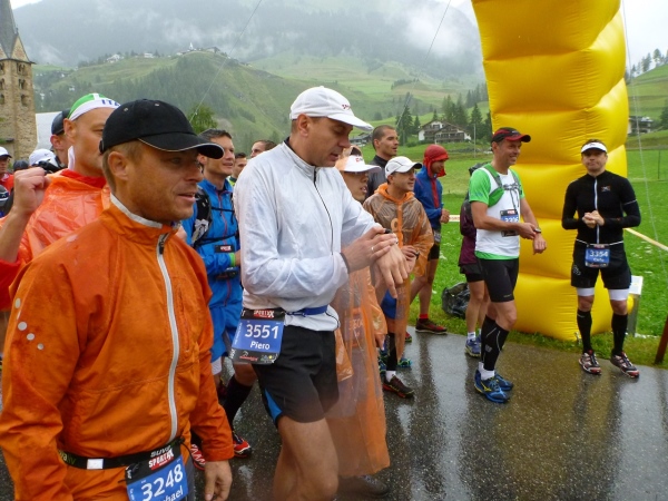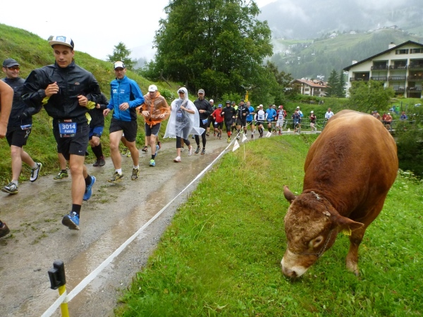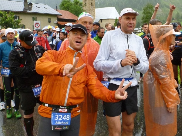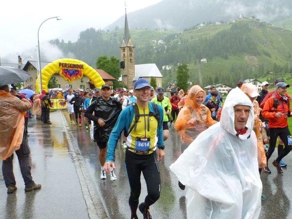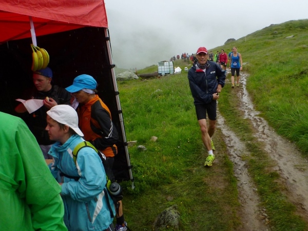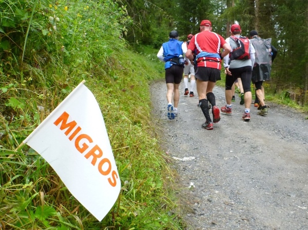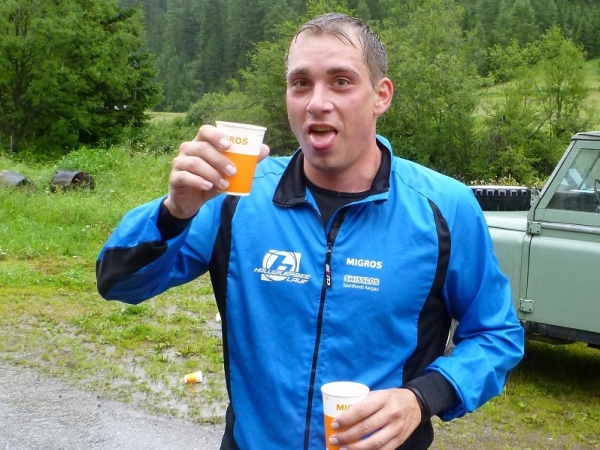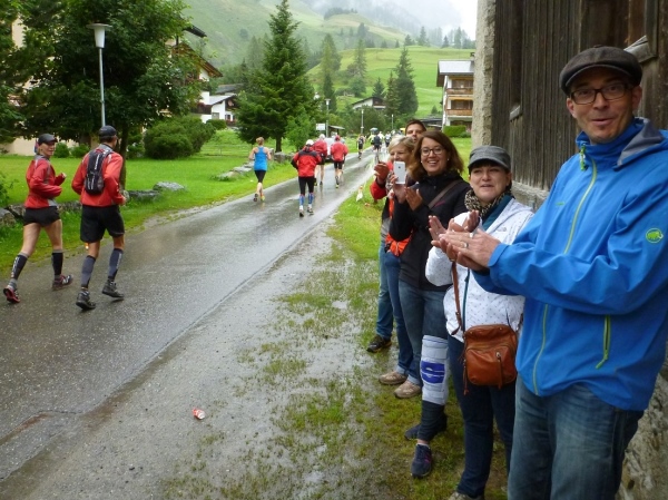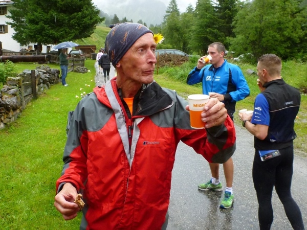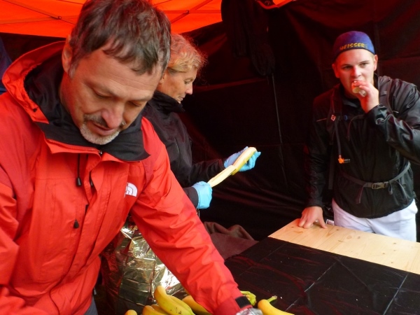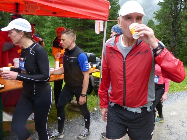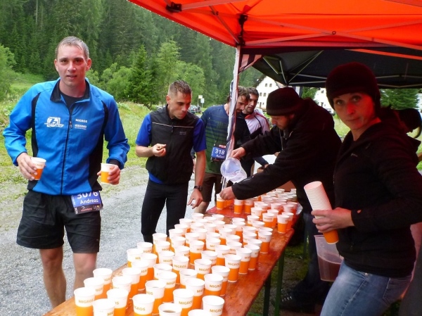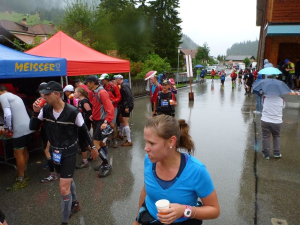In der Ortsmitte kündigt ein Moderator die einlaufenden Teilnehmer namentlich an. Ein paar Meter weiter wird an der ersten Versorgungsstelle schon eifrig zugegriffen. Das Angebot ist riesig: Neben Wasser werden Bananen, Riegel, Alpinbrötli, Powerbar, Gel, Mineraldrink mit Lemon und Orange-Geschmack, Gemüsebouillon und Cola gereicht. Es ist zwar nicht an jeder Tankstelle das ganze Angebot vorhanden, doch verhungern und verdursten ist unmöglich. Schon jetzt schmecken mir die warme Suppe und die Alpinbrötli vorzüglich.