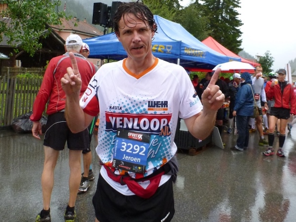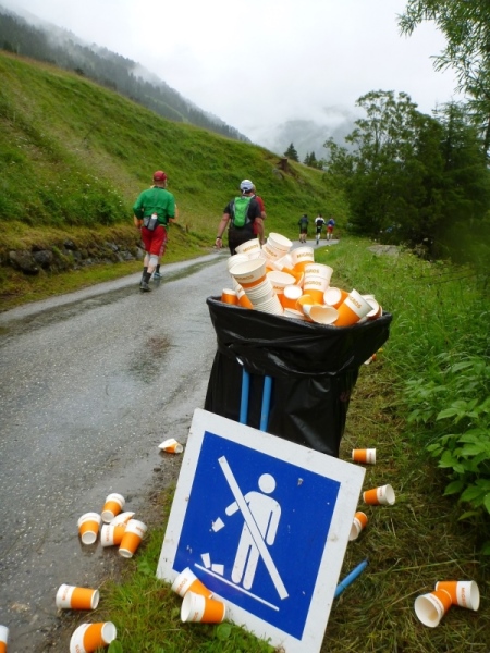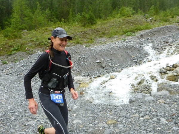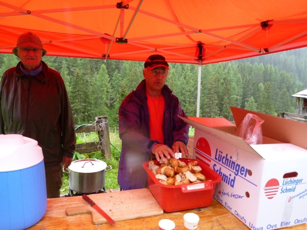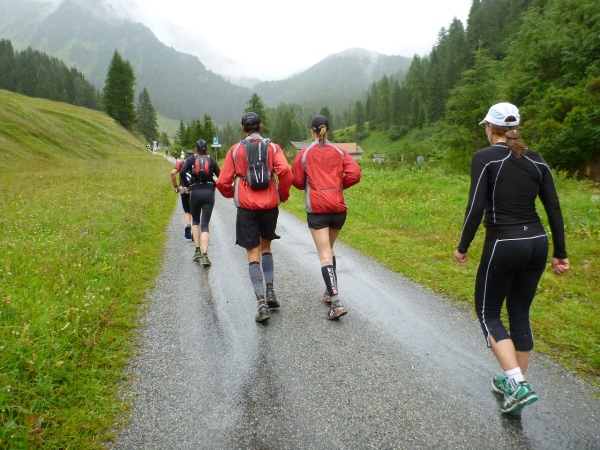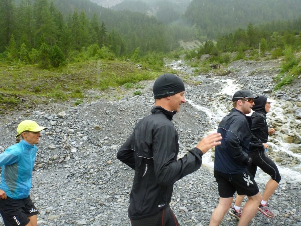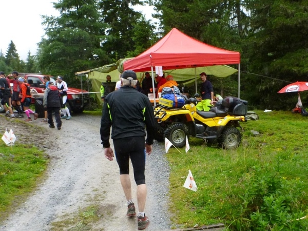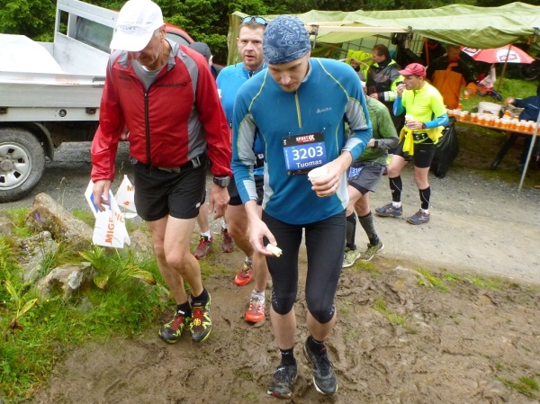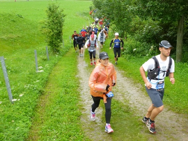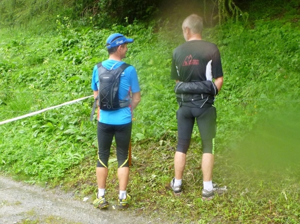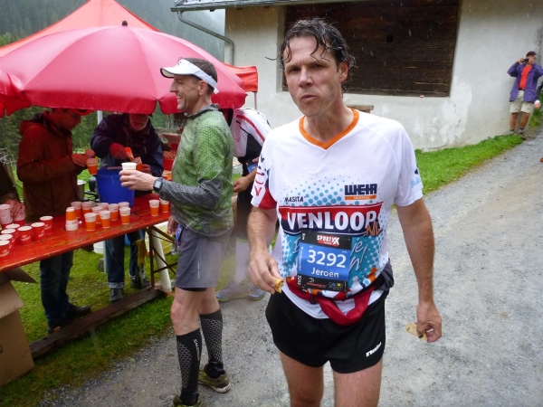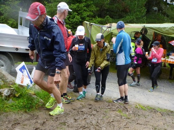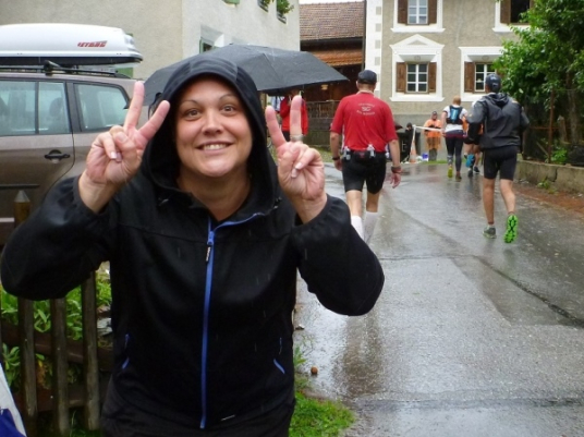 In der Ortsmitte kündigt ein Moderator die einlaufenden Teilnehmer namentlich an. Ein paar Meter weiter wird an der ersten Versorgungsstelle schon eifrig zugegriffen. Das Angebot ist riesig: Neben Wasser werden Bananen, Riegel, Alpinbrötli, Powerbar, Gel, Mineraldrink mit Lemon und Orange-Geschmack, Gemüsebouillon und Cola gereicht. Es ist zwar nicht an jeder Tankstelle das ganze Angebot vorhanden, doch verhungern und verdursten ist unmöglich. Schon jetzt schmecken mir die warme Suppe und die Alpinbrötli vorzüglich.