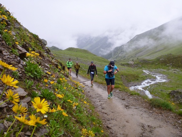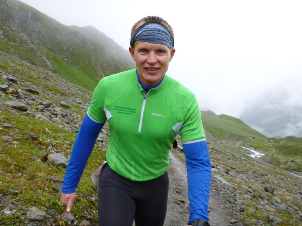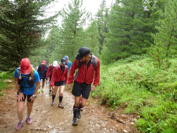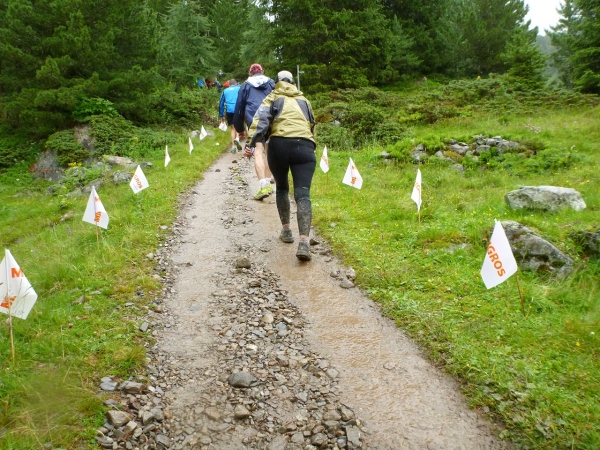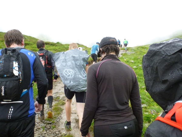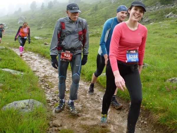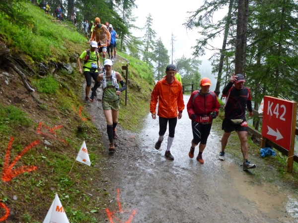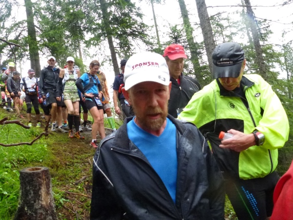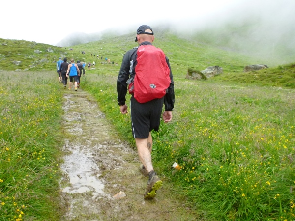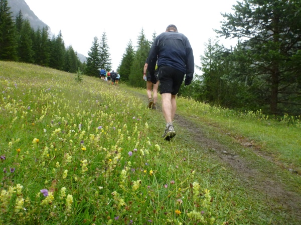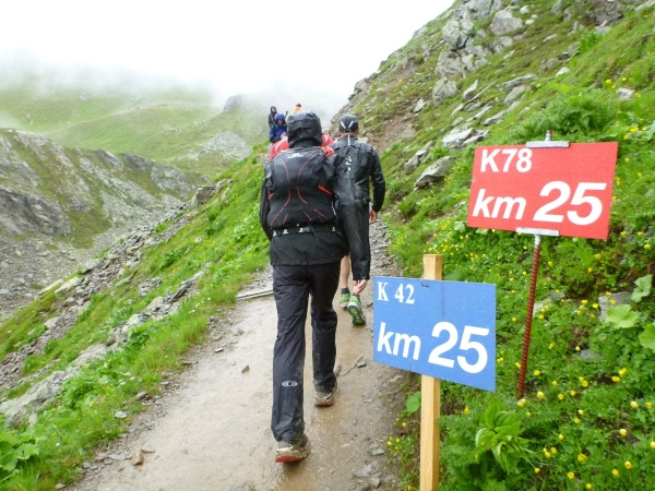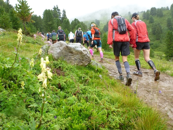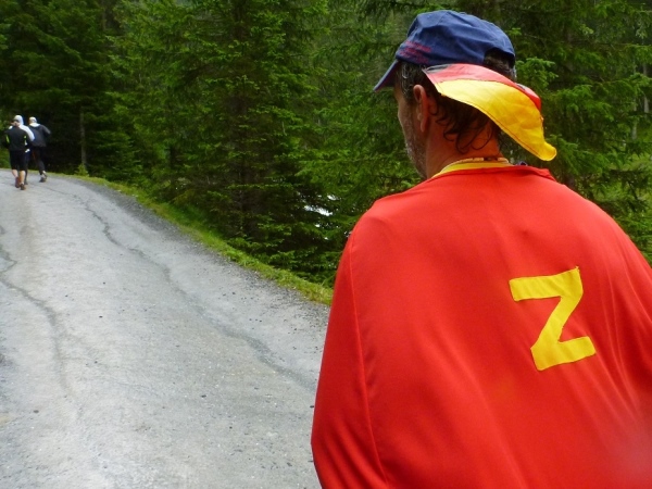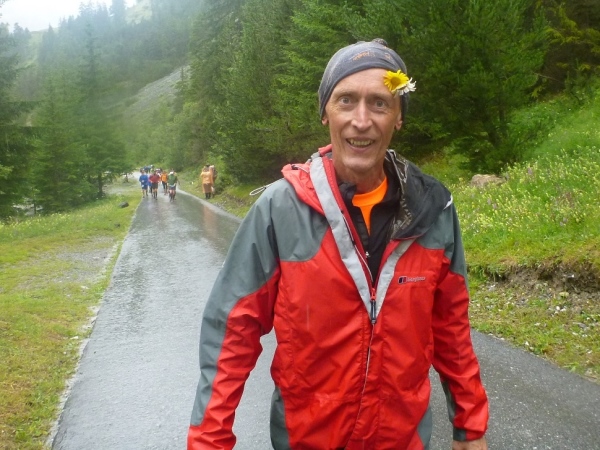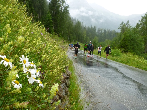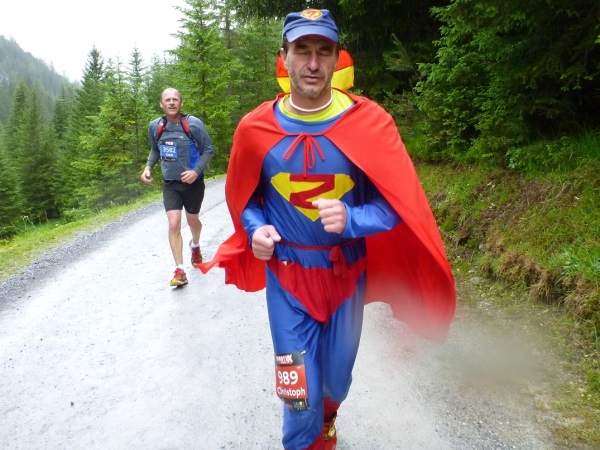 Um den für das Wetter Zuständigen da oben milde zu stimmen, steckt sich der Autor wieder einmal ein paar Blumen ins lockige Haar. Später erfahre ich, dass die Margeriten geschützt sind, aber die Naturranger gehen bei dem Wetter nicht aus dem Haus. Einer läuft im Supermann-Kostüm den langen Kanten. Christoph Zitzmann, ein Landsmann. Die leichte Steigung kommt mir recht. Denn einige der K78 sind am Marschieren und so kann ich immer wieder auf einige auflaufen. Die meisten verbreiten gute Laune, wissend, dass sie jeder Schritt der Keschhütte und damit ihrem zweiten Zwischenziel näher bringt.