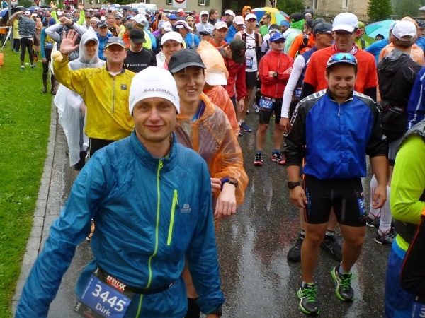 Etwa 15 Minuten vor unserem Start gebe ich meinen Rucksack ab. Außer einer langen Hose und einer Trinkflasche ist da nichts drin. Handschuhe habe ich erst gar nicht von daheim mitgenommen. Die könnte ich aber brauchen, denn viele Läufer haben solche Dinger bereits an oder zumindest „am Mann“. Die vorhergesagten 10 bis 20 Millimeter Niederschlag müssten schon heruntergekommen sein, aber der Himmel ist weiterhin grau in grau.
