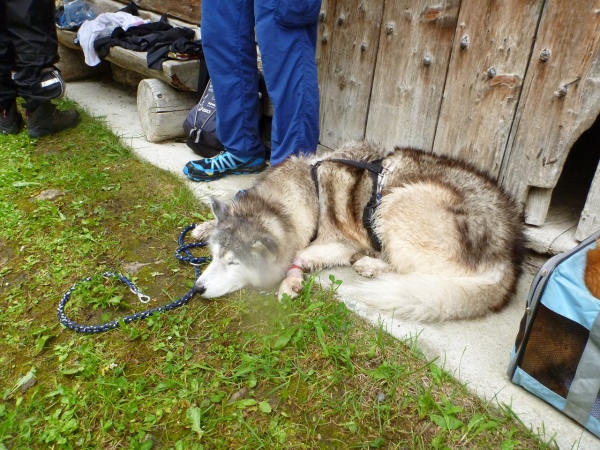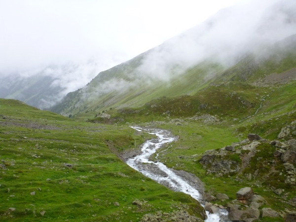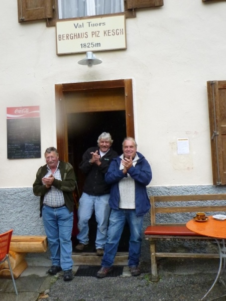 Der Baumbewuchs liegt weit hinter uns, immer weiter führt uns der Bergpfad hinauf, oft müssen wir Bachläufe und Rinnsale überqueren. Und dann kann ich auf einen auflaufen, der heute Nacht neben mir in der Jugi geschnarcht hat. Na, du warst recht ruhig, Hans (Schenker). Mittlerweile gibt es Spannungsprobleme. Nicht bei mir, aber bei der Kamera. Der Saft wird knapp, und so taucht die Keschhütte in Nebel auf. Hurra, gleich sind wir oben.