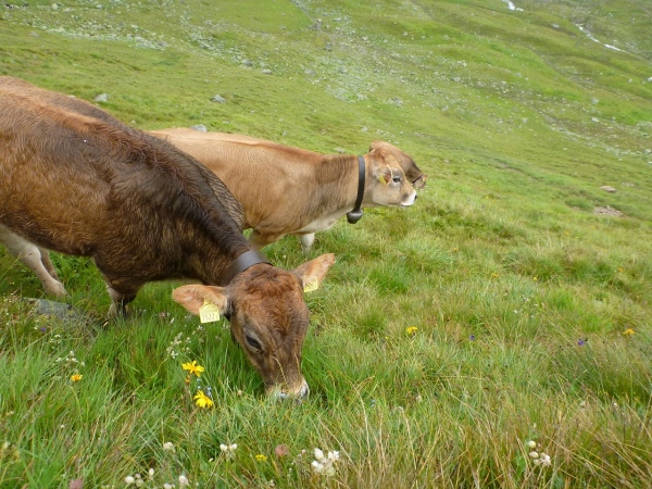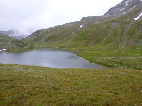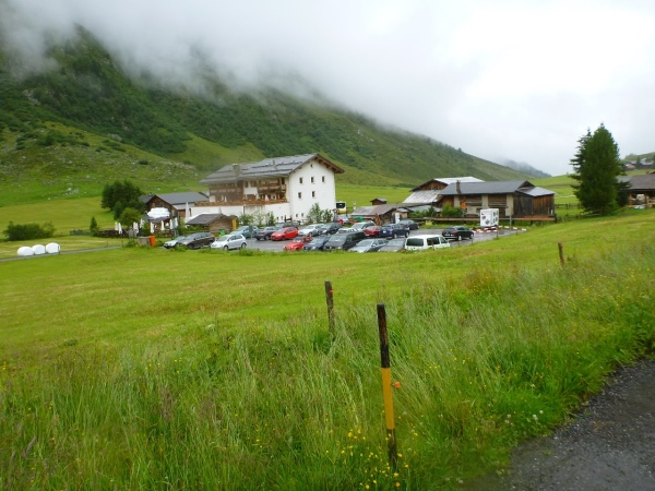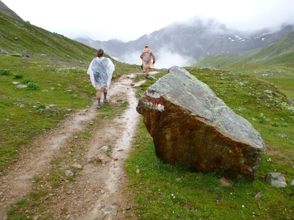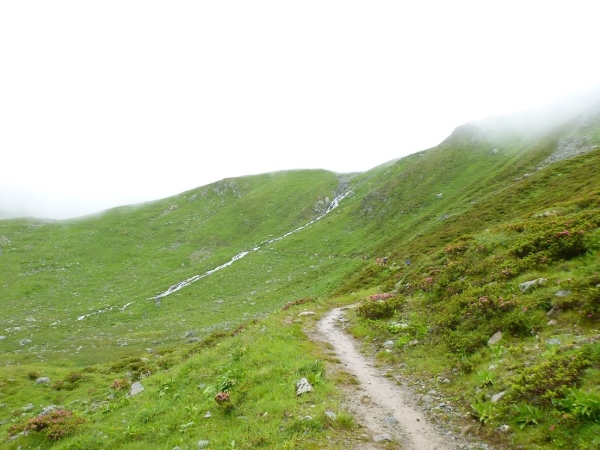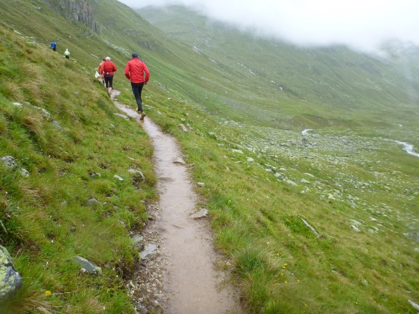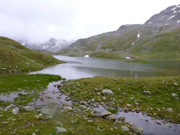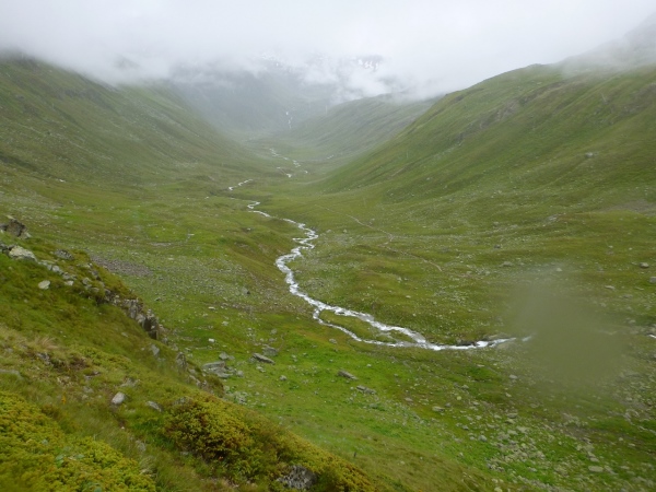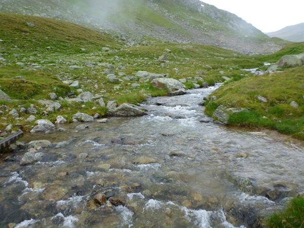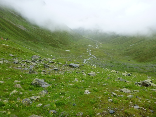 Etwa 200 Höhenmeter geht es hinunter ins Val dal Tschüvel. Linkerhand könnten wir mit dem Piz Forum und dem Pix Murtelet zwei Dreitausender sehen, aber die hüllen sich in Dunst und Nebel. Immer wieder müssen wir Wasserläufe überqueren oder über kleine Bächlein springen. Es macht richtig Spaß. Die nächste Tankstelle, quasi im Niemandsland, bietet uns trotzdem Wasser, Iso und Müsliriegel an. Toller Service.