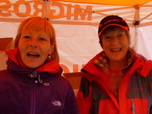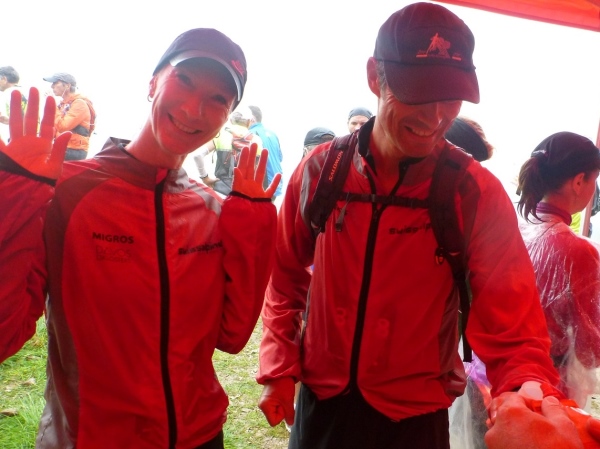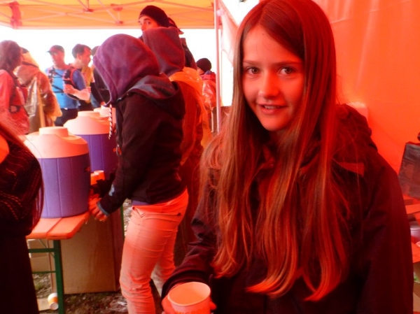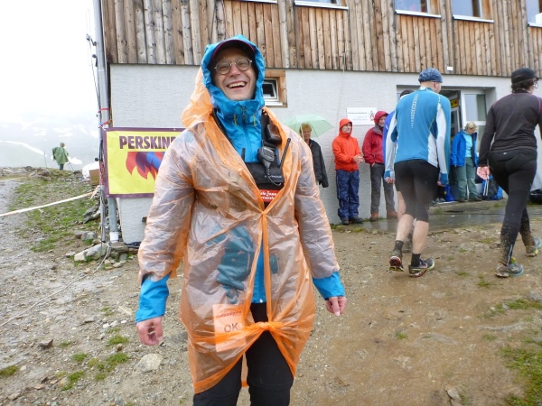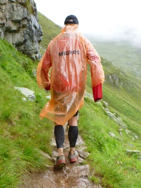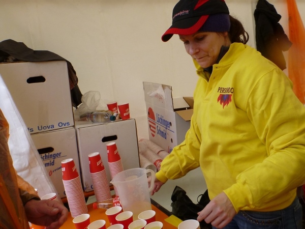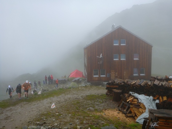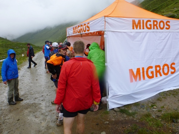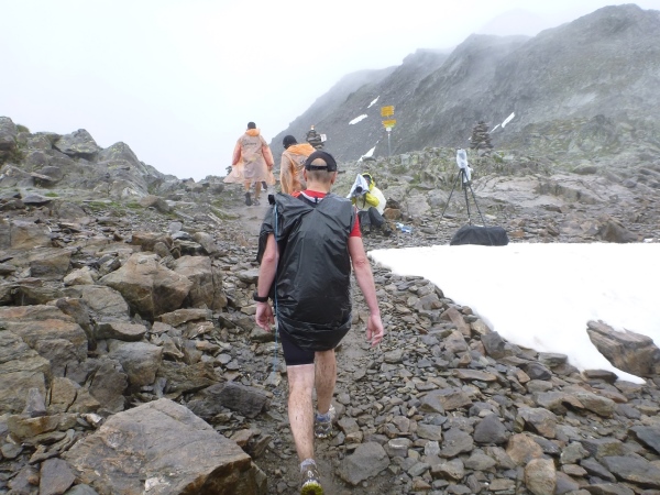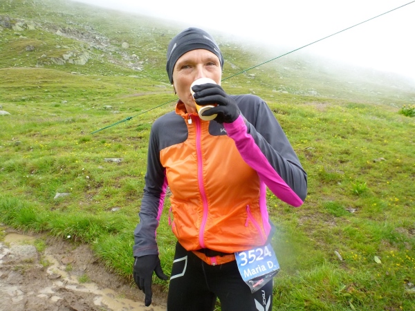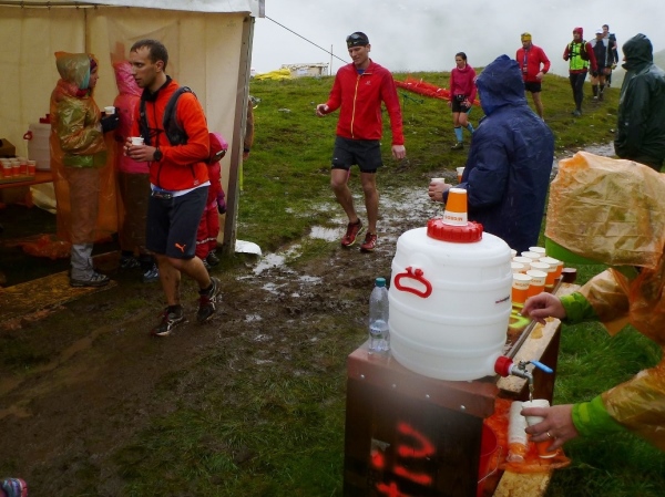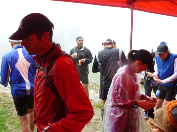 Ein paar Meter weiter ist das Verpflegungszelt, wo ich mich für eine Minute verkrieche, um den notwendigen Batteriewechsel einigermaßen trocken über die Bühne zu bringen. Anschließend verpflege ich und mach mich wieder auf die Strecke. Durch die zwei, drei Minuten Aufenthalt sind meine Finger ganz klamm geworden. Außerdem pfeift der Wind gehörig über den Berg.