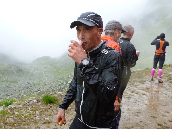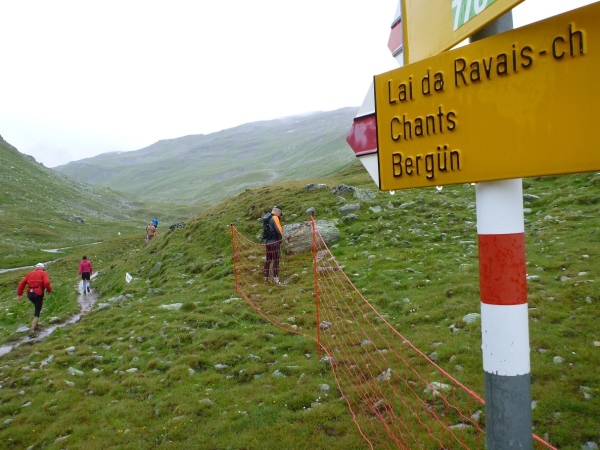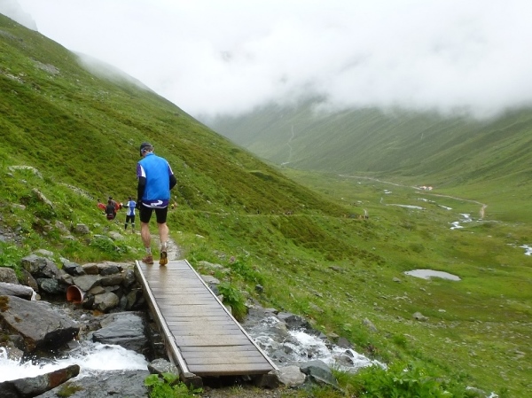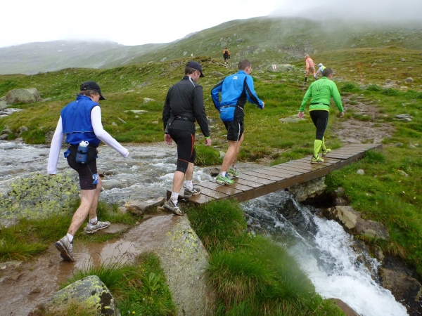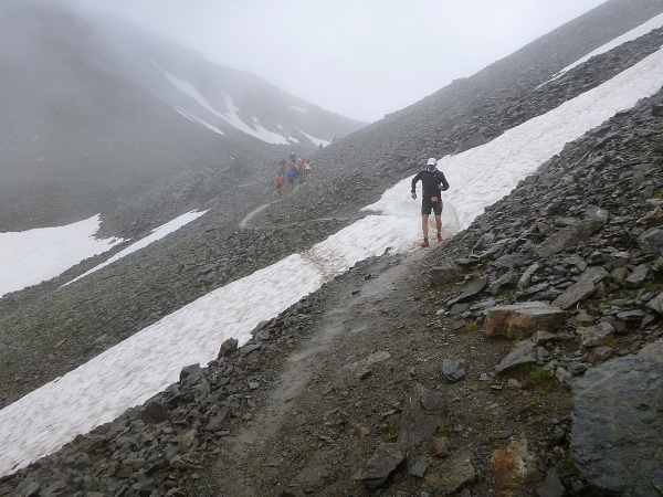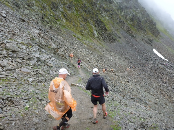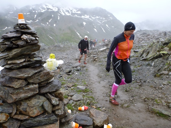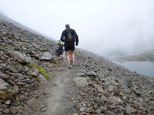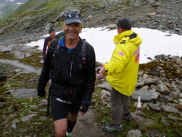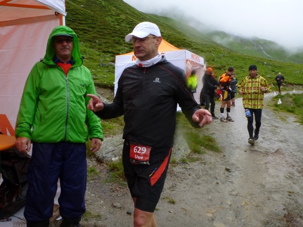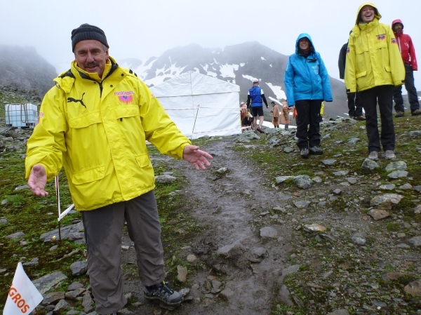 Schon von weiten sehe ich den, der dir tief in die Augen blickt. Der Rennarzt schaut sich jeden Läufer an, spricht ihn an oder gibt ihm eine kleine Aufgabe, um so zu testen, ob der noch im Hirnkastel richtig tickt. Wer in maladen Zustand hochkommt, muss tatsächlich damit rechnen, aus dem Rennen genommen zu werden, oder zumindest eine Zwangspause verpasst zu bekommen. Ausweichen geht nicht, denn der Weg führt direkt auf den Medizinmann zu und wer über die Steine klettert, macht sich gleich doppelt verdächtig.