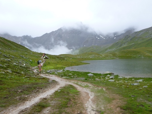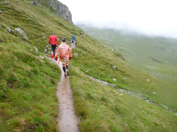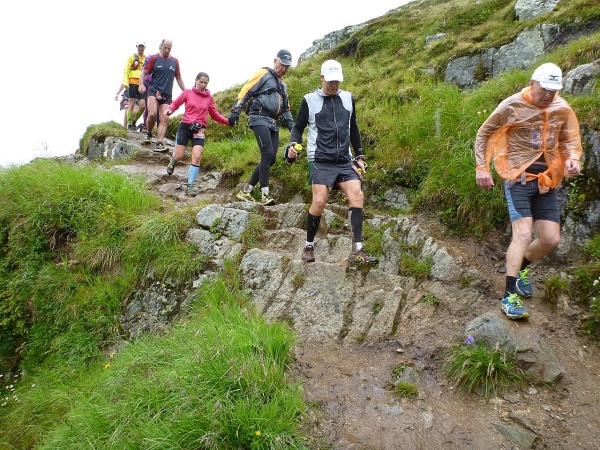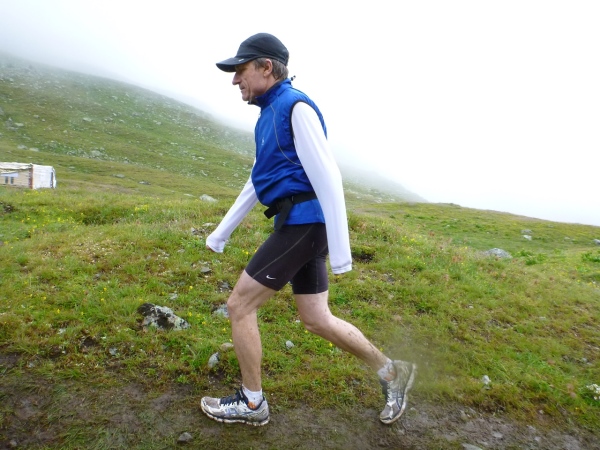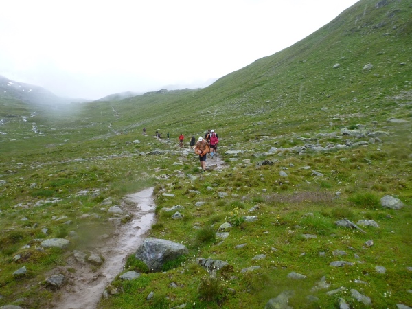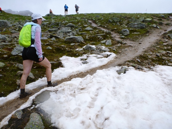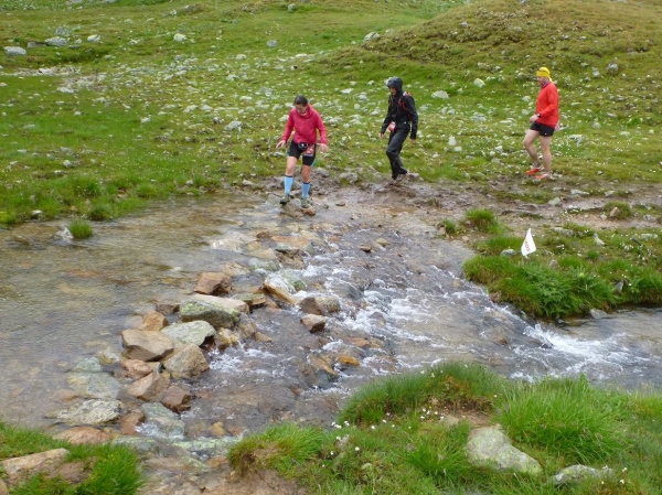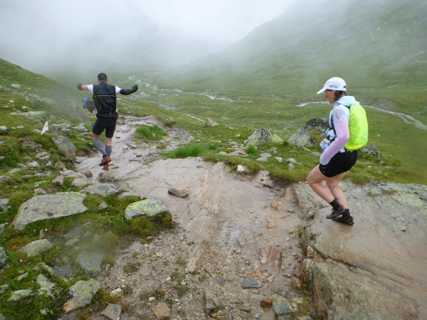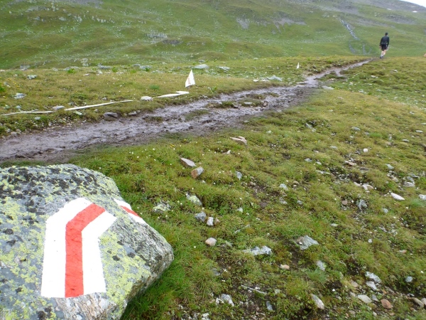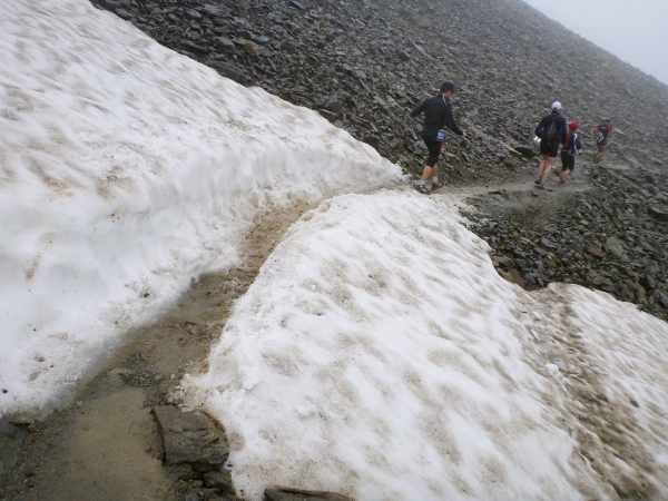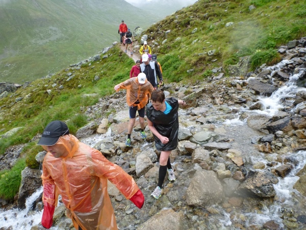 Schon von weiten sehe ich den, der dir tief in die Augen blickt. Der Rennarzt schaut sich jeden Läufer an, spricht ihn an oder gibt ihm eine kleine Aufgabe, um so zu testen, ob der noch im Hirnkastel richtig tickt. Wer in maladen Zustand hochkommt, muss tatsächlich damit rechnen, aus dem Rennen genommen zu werden, oder zumindest eine Zwangspause verpasst zu bekommen. Ausweichen geht nicht, denn der Weg führt direkt auf den Medizinmann zu und wer über die Steine klettert, macht sich gleich doppelt verdächtig.