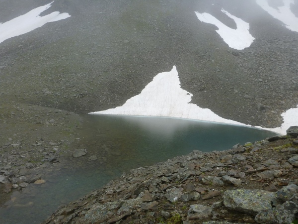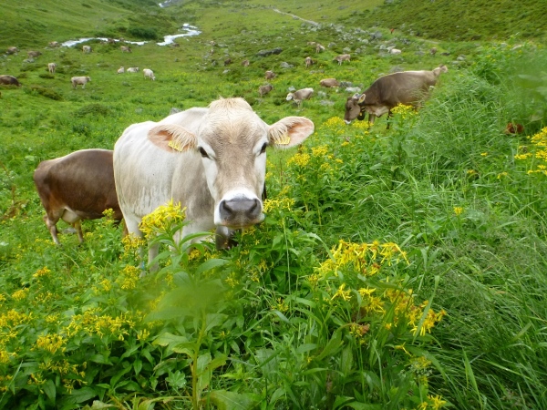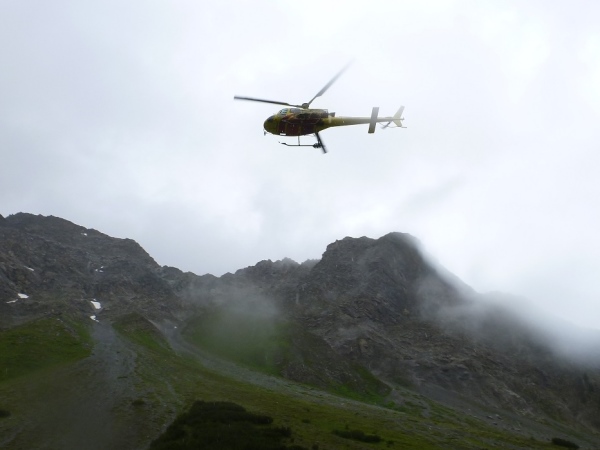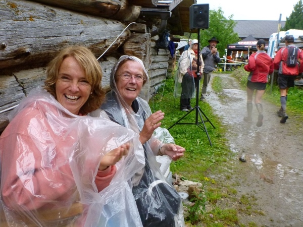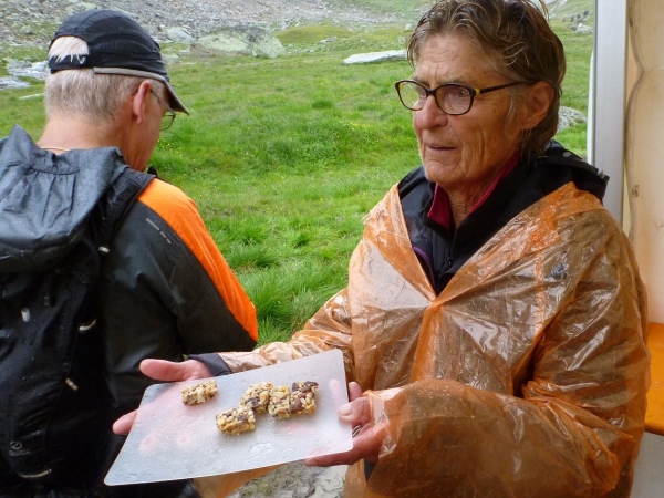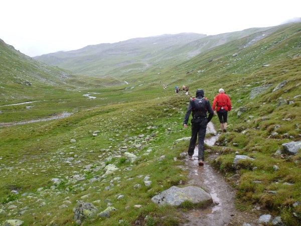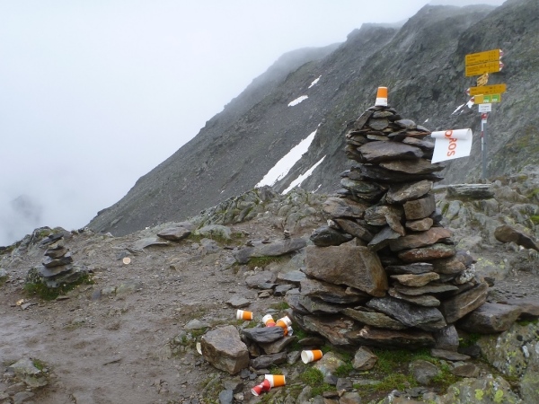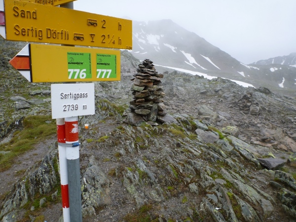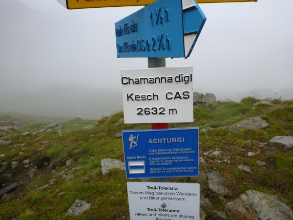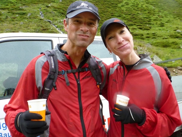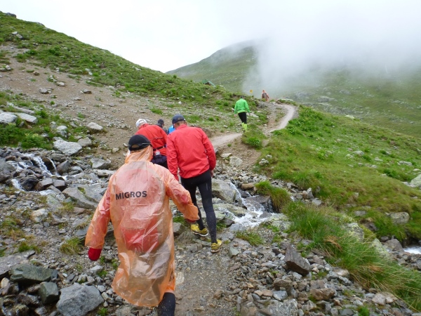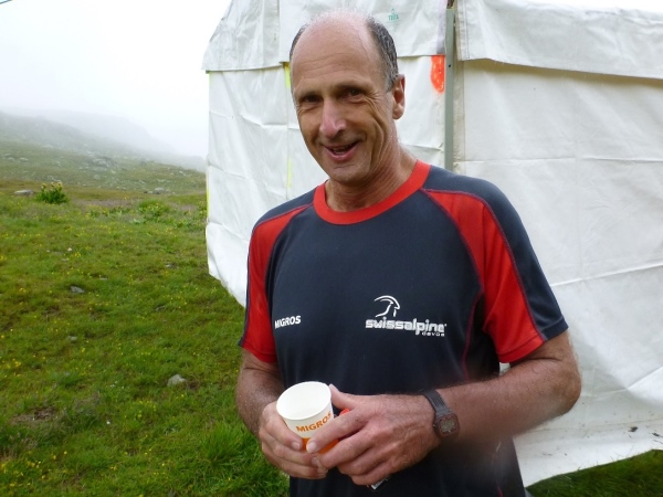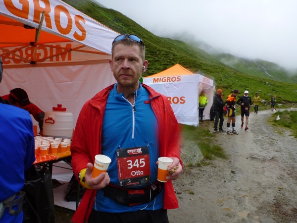 Vor dem Verpflegungszelt sehe ich einen weiteren Medicus, der mir als erstes nicht in die Augen, sondern auf die Blumen an Mütze und Jacke schaut. „So viel Zeit muss sein“, sage ich. Da lachen auch die zwei Mädels los. Eine schnappt sich die Kamera und knipst los. Auch hier kann voll versorgt werden. 30 Meter weiter ist dann der Pass, der zwischen Mittaghorn und Chüealphorn, auch Dreitausender, liegt. Zwei Stunden Zeitbedarf, sagt der Wegweiser hinunter nach Sand an.