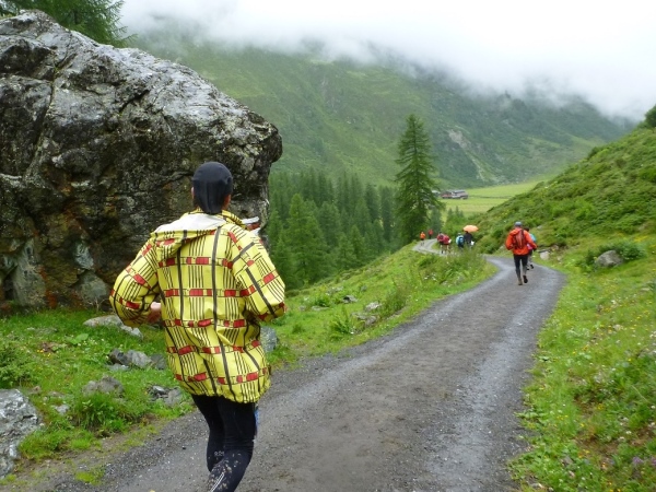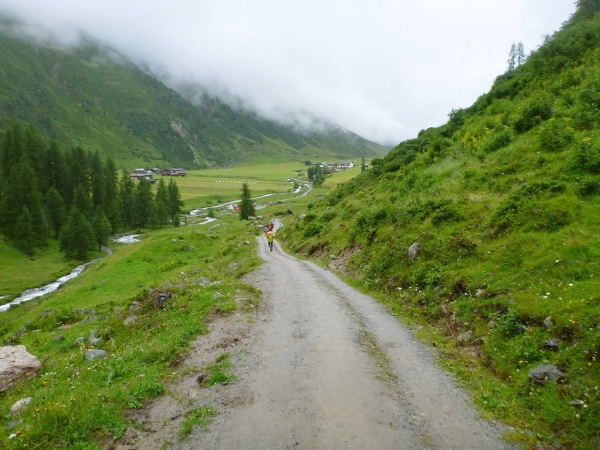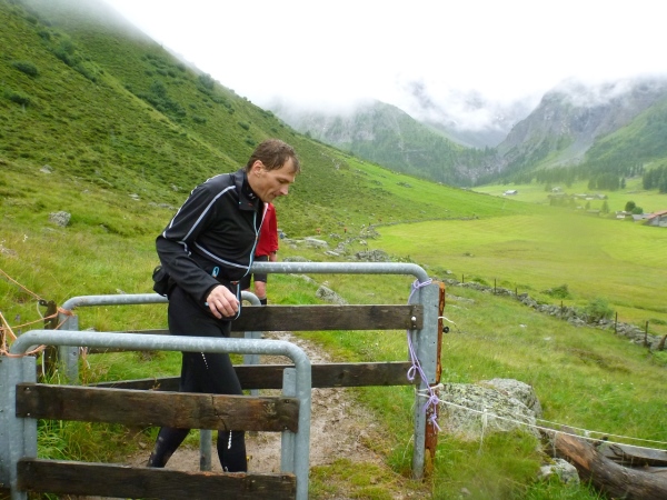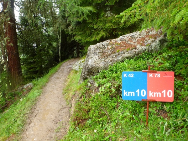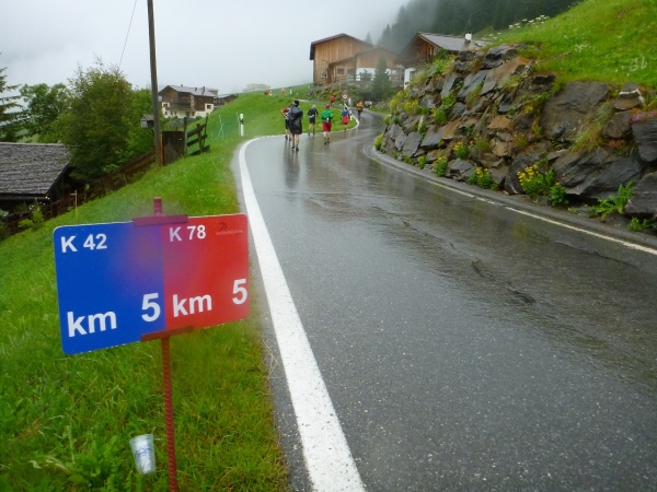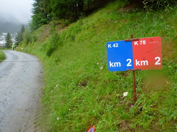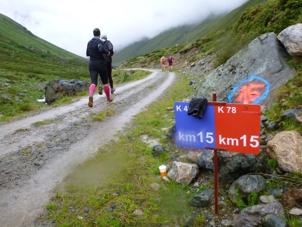Die Steinwüste endet und das Grün der Almwiesen beginnt schon auf etwa 2400, 2500 Meter Höhe. Jetzt geht es das Chüealptal hinaus. Ein Verrückter kommt von hinten und versägt mich. Der Norbert, dem ein K78 zu wenig ist und der gleich einen Doppeldecker mit C42 und K42 an einem Tag braucht. An der Tankstelle Chüealp haben wir bereits 27 Kilometer hinter uns und es geht nun auf breiter Bergstraße hinunter. Ein paar Meter weiter werden noch 15 restliche Kilometer angezeigt.