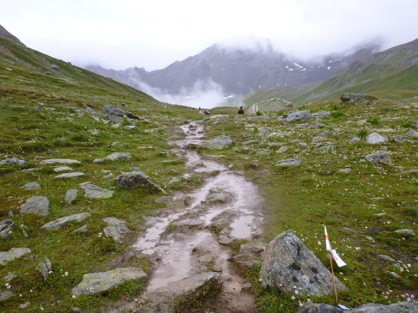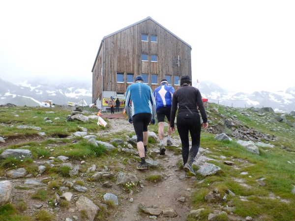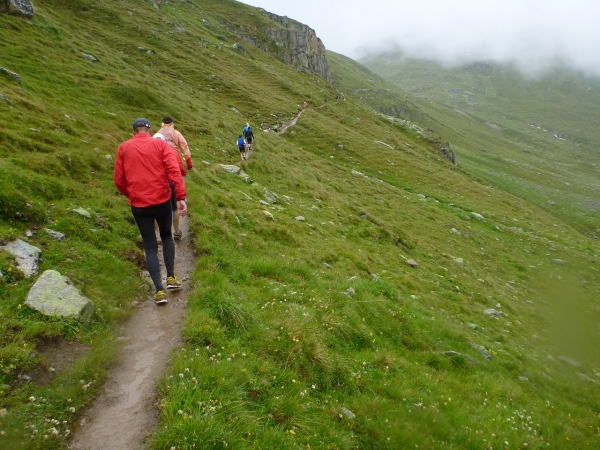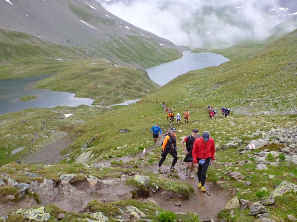 Irgendeiner im Feld sagt, noch 20 Minuten, dann haben wir fertig mit dem Sertig. Zuvor umlaufen wir die zwei Ravais-ch-Seen, um an deren Ende die letzten finalen 200 Höhenmeter zum 2739 hohen Sertigpass aufzusteigen. Der Anstieg ist technisch nicht schwer, in Serpentinen geht es nach oben, bis ich einen Funkmast und ein Zelt entdecke. Und dann sehe ich das Top of Swissalpine.
