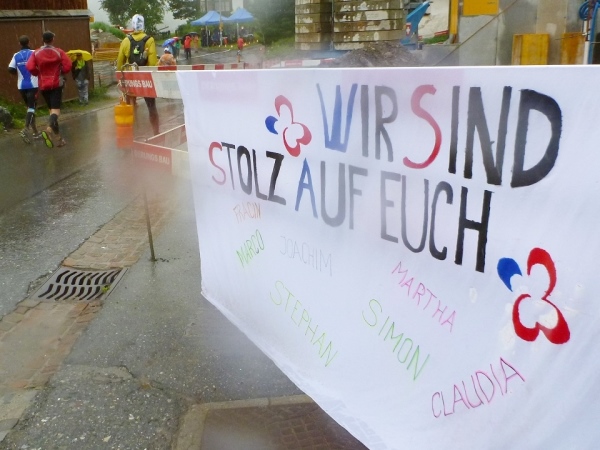 Noch fünf Kilometer, sagt die Kilometertafel am Ortseingang von Clavadel. Und kurz darauf ein großes Plakat „WIR SIND STOLZ AUF EUCH“. Und wir erst auf uns, denn jetzt kann uns nichts mehr halten. Mittlerweile kann ich von meinem Trainingszustand zehren, denn es rollt auch noch an den letzten Steigungen.