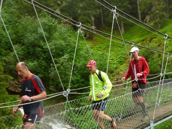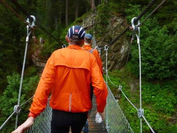 Wer jetzt meint, der Kurs geht schnell das Tal hinaus, den muss ich enttäuschen. Wir laufen anfangs noch in Sichtweite zur Straße, dann bleiben wir auf der Höhe und verlieren nur wenige Höhenmeter. Weiterhin bleibt der Weg schmal, hat immer wieder ein paar Unwägbarkeiten wie Löcher, Wurzeln und Steine. Und dann wartet noch eine kleine Hängebrücke, vielleicht 20 Meter lang. Mein Zimmerkollege, der Hans, der kann's und bleibt mir gehörig im Nacken. Lange stehenbleiben für die Fotoarbeit darf ich nicht, denn dann spüre ich seinen heißen Atem im Nacken. Bei Boden, der vorletzten Tankstelle, greife ich zur schwarzen Brause.