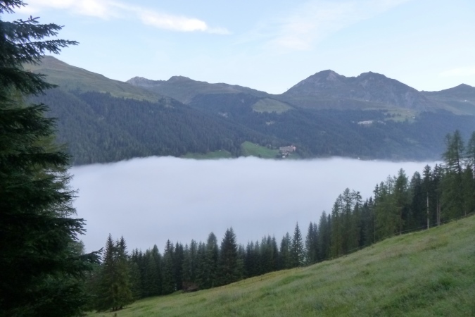 Kurz aus dem Wald raus, durch Clavadel, noch mal kurvig- wellig, dann die breiten Fahrwege, im Winter wohl Skipisten, ein letzter Berg – und Davos liegt vor mir.