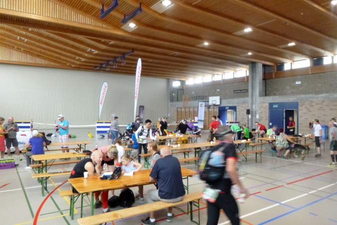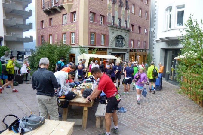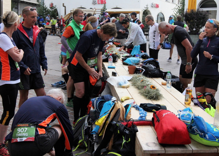 In der Halle ist viel los. Unsere Dropbags liegen bereit, lecker essen und vor allem trinken. Wie schon in Samedan, schlage ich bei der köstlichen Pasta ordentlich zu und mache ein kleines Schläfchen. Eine Viertelstunde reicht. Power-nap. Und nun regnet es. Der Wetterbericht hatte doch recht. Aus Tropfen werden Bindfäden. Wer gerade reinkommt, ist nass durch und durch. Also nochmal zurück und Vollschutz angelegt. Blöd nur, dass es immer noch warm ist, so 20°. Schrecklich. Nass vom Regen oder vom Schweiß. Hier kann man wählen.