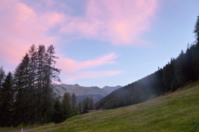Immerhin, hinter dem Pass geht’s nur noch abwärts. Sertig-Dörfli, das ist das Ziel. Aber die Geröllhalde davor ist furchtbar. Lose Brocken, kein Spaß trotz Vollmond. Aber unten ist dann der breite Fahrweg, eben und glatt und immer nur runter. Hier könnte man Strecke und Zeit gutmachen, zumindest für 5 km.
