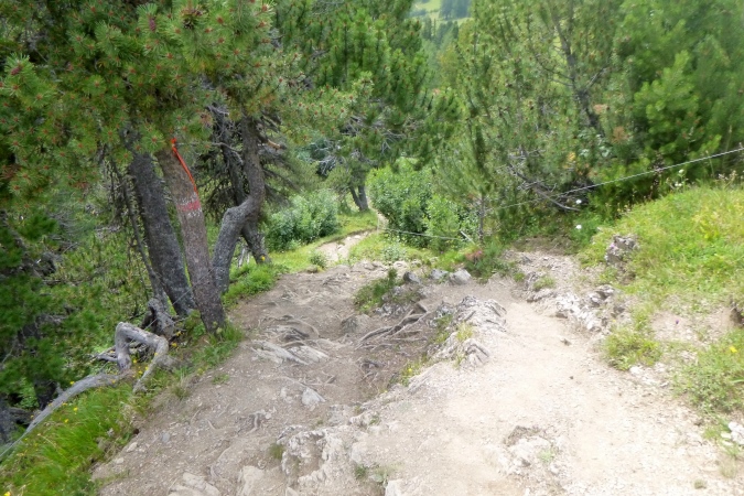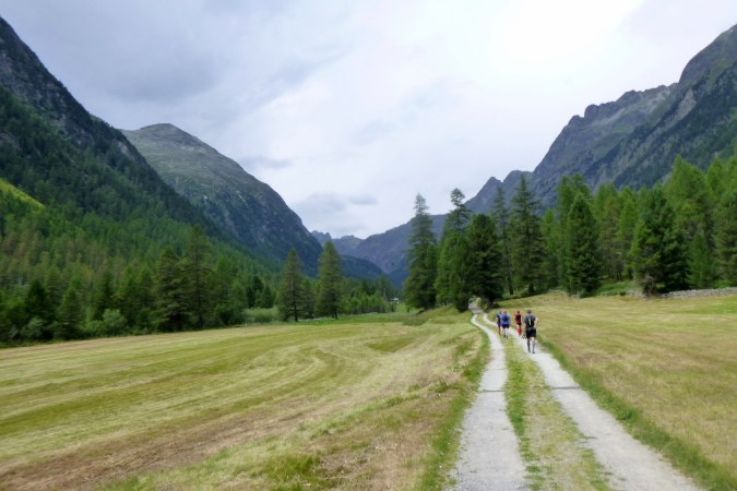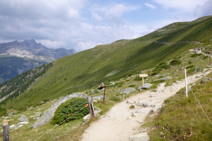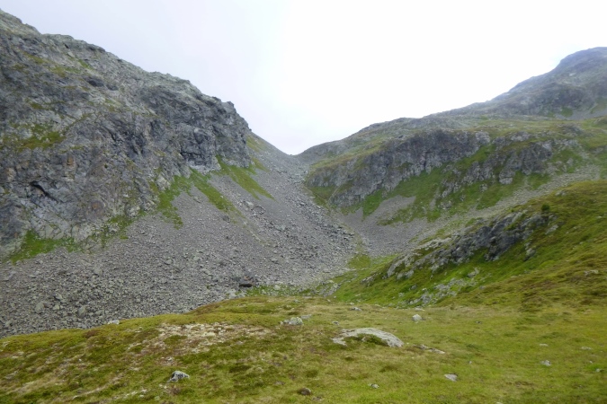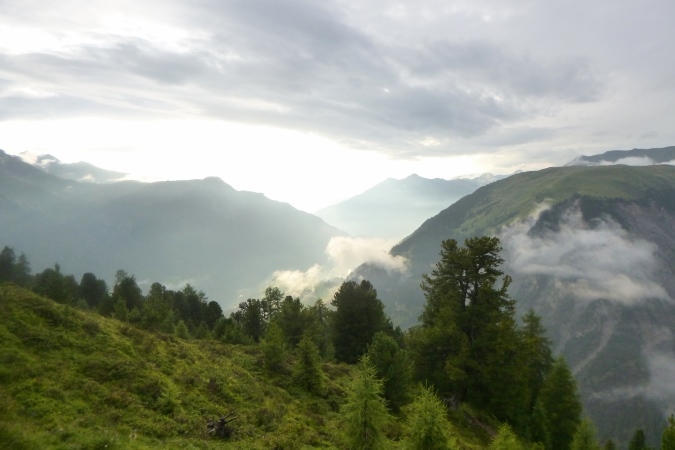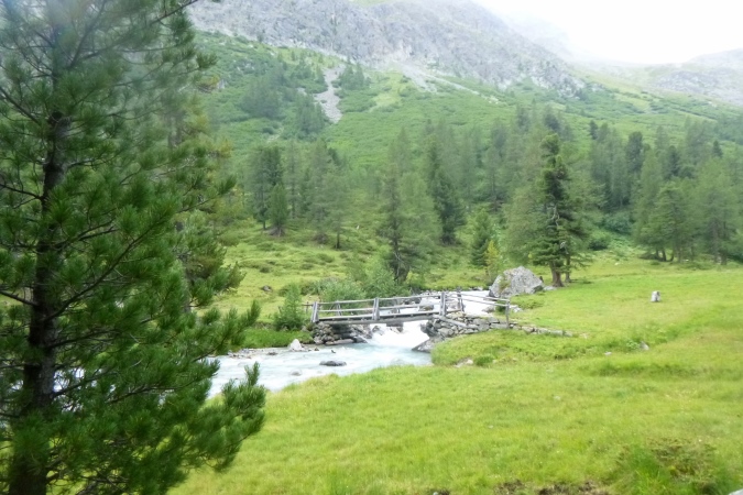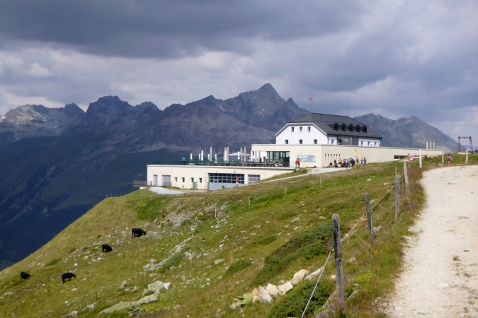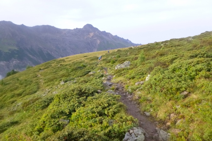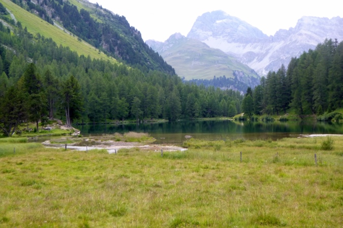 Den Ort verlassen wir recht schnell und erreichen (eher flach) den Zugang ins Val Bever. Entlang des Baches und der Bahnstrecke steigen wir unermüdlich auf den nächsten 7 km etwa 200 m an, in wechselnder Steigung. Spinas mit der Baustelle des neuen Albulatunnels ist schnell erreicht, alles auf Schotter. Und danach auch. Uns begegnen reichlich Biker, die in rasendem Tempo den Weg runterflitzen, manche können erst in allerletzter Sekunde ausweichen! Also Obacht hier, ganz außen gehen, bis zum Posten Palüd Marscha. Und dort nochmal auftanken, was geht. Der nächste Berg kommt. 400m, sausteil. Nasse Wolken umgeben uns, so mancher legt seinen Regenschutz an. Es ist aber noch nicht schlimm, und oben am Pass wird’s auch trocken. 2466 m, der zweite Berg. Im Geröll, erst flach, dann immer steiler, an Bergseen vorbei, durch kleine Bäche, wieder runter. Mit einer prächtigen Aussicht in unberührte Bergwelten.