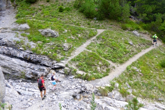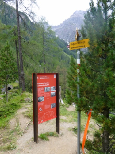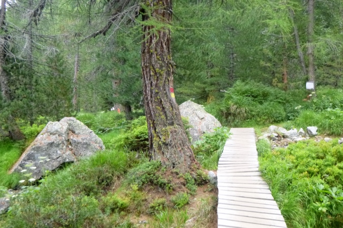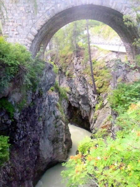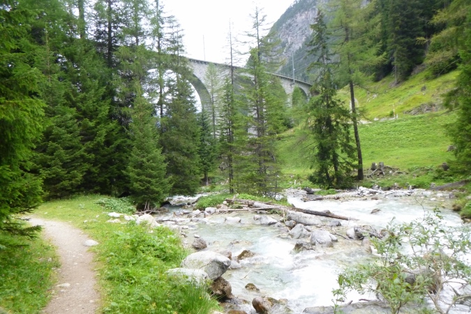 Der wunderbare Trail leitet uns weiter abwärts, in Naz ist ein hochwillkommener Posten. Alles gibt’s hier, von Bouillon bis zum Muffin, ein Schlemmererlebnis. Und beim Nachbarn gibt es Bier, wenn man denn ganz lieb fragt…Der ist begeistert von uns und hat die Brücke über den Bach unter einen Sprühnebel zur Abkühlung gelegt, das passt gut. Noch etwa 5 km bis Bergün, auf Trails immer weiter runter. Waren wir vorhin noch auf 2466 m, müssen wir jetzt auf 1370m absteigen. Das ist reichlich und bisweilen lehrreich, denn wir kreuzen mehrfach die Bahnanlagen mit den vielen Viadukten. Bahnlehrpfad heißt der Trail hier, auf großen roten Tafeln werden die Geheimnisse des Bahnbaus erläutert. Also Modellbahner aufgepasst! Quer über den Campingplatz Albula an den Fluss, über eine flache Wiese, an den nächsten Fluss, auf die alte 78er Strecke und in den Ort. Halbzeit.