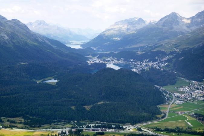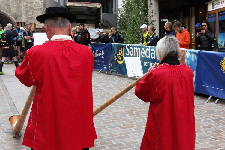 Weicher Waldboden, fester Schotter. Der Stazerwald sieht wie eine Parklandschaft aus, so ordentlich-gepflegt. Da passen die netten Kleinigkeiten (Zerrspiegel oder die Uhrenbank) ganz gut rein. Und erstmal der herrliche Waldsee… So geht das bis Pontresina. Dort ist der erste VP. Getränke, mehr brauchts noch nicht. Die Bouillon ist spitze und nötig. Etwas Salz tut gut, denn unmittelbar danach folgt ein krasser Anstieg. Er ist ja nicht lang, aber steil und bietet einen Vorgeschmack auf weiteres. In der Sonne (die Wolken sind weg) tappen wir auf dem Trail hoch, verschwinden im Wald und marschieren stramm weiter, über die Baumgrenze nach Muottas Muragl, einer großen Bergstation mit einfach fantastischer Aussicht in alle umliegenden Täler, St. Moritz und Engadiner Seenplatte. Und auf die weißen Berge des Oberengadin. Gnadenlos toll. Ein Alphornduo begrüßt uns. Die beiden haben uns schon den Start verschönert.
