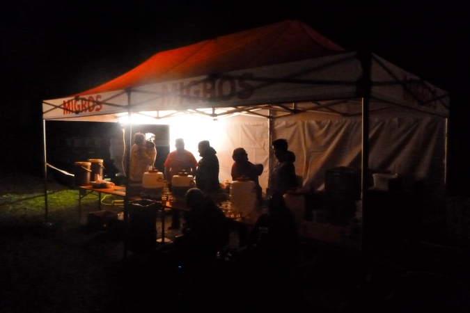 Auch ohne Licht finde ich die Markierungen, es hilft meine Streckenkenntnis. 200 m runter und 300 wieder hoch, im Geröll, durch unzählige kleine Bäche. Weit, weit voraus, in unglaublicher Höhe, blitzt ein Licht. Immer, wenn ein Läufer vorbeikommt, entsteht ein Foto. Der arme Kerl sitzt, nein, kauert in einem winzigen Zelt, lauert uns auf und flasht uns blind. Vorher ist aber noch der Posten Sertigpass mit Lagerfeuer, guter Versorgung und fleißigem Team. Auch hier bleibe ich ein Weilchen in der warmen Decke.