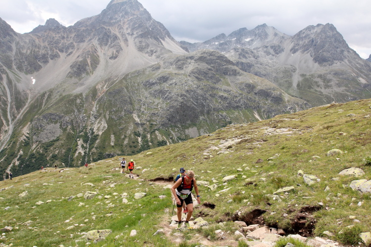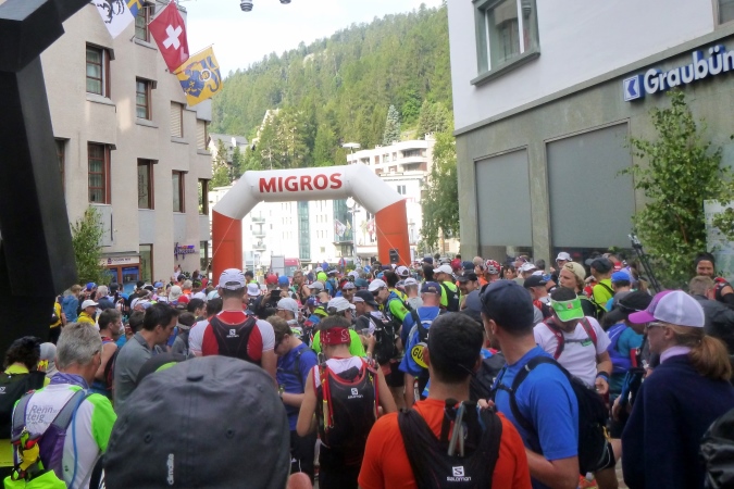 Wie sie es gemacht haben, weiß ich nicht, aber sie haben die Gluthitze der letzten Tage für 24 Stunden abgestellt. Einfach ein paar Wolken vor die Sonne und gut ist. Sehr angenehmes Laufwetter für uns. Schon seit Mitternacht sind die 127er unterwegs, hier ab St.Moritz, dem neuen Startort für die langen Trails. Ziel ist Davos für alle Läufe aus dem großen Baukasten. Man kann sich wirklich das Passende aussuchen. Meiner heute heißt T88 und ist auch etwa so lang wie er heißt. Früher war das der K78, Davos-Davos, eine wahre Legende in der Ultrawelt. Heute wird es länger und schwerer, 25,5 Stunden bis Zielschluss. Ranhalten heißt das.