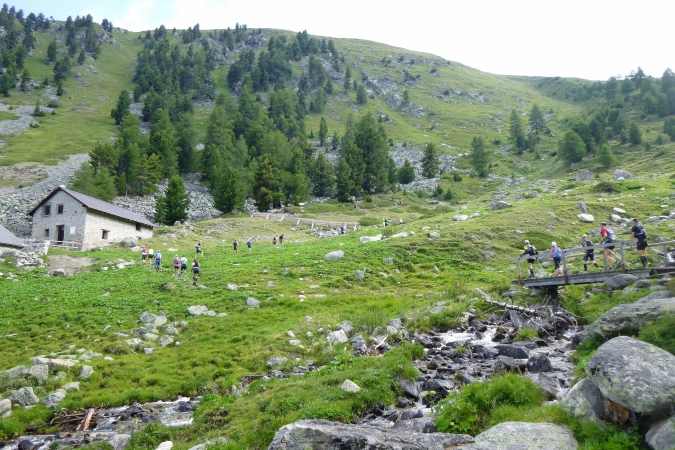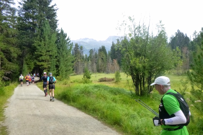 Bald hat uns der Wald wieder, weicher Boden macht das Laufen leicht. Aber nur bis unten, da fängt nämlich eine lange Schotterpiste an, über zwei Flüsse und am Flugplatz längs. Eher die unspektakuläre Strecke. Sie endet in der Halle in Samedan. Vollversorgung, Dropbags für die 127er, so manche sind schon 12 Stunden unterwegs. Und müde. Wir haben den ersten von 4 Bergen geschafft, da kommt noch so einiges.