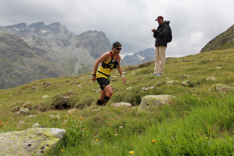 Weiter unten taucht die Passstraße auf. Ein Posten sichert den Übergang. Ganz tief unter uns verläuft der Albulatunnel der Bahn. Bei Preda werden wir die andere Öffnung erreichen, mit den riesigen Steinhaufen und Förderbändern. Aber vorher erleben wir einen der schönsten Bergseen in weiter Runde, den Palpuogna. Ein fantastischer Wald, herrliches Geläuf, und das am Ufer des kristallklaren Sees. Riccardo und Aselia begegnen mir hier, er filmt mich, ich fotografier zurück. Er hat auf youtube einen blog, ich den Bericht bei trailrunning,de. Und er kennt mich, zitiert meine Hefeweizen-Halluzination! Mann, was habe ich plötzlich wieder einen Brand!