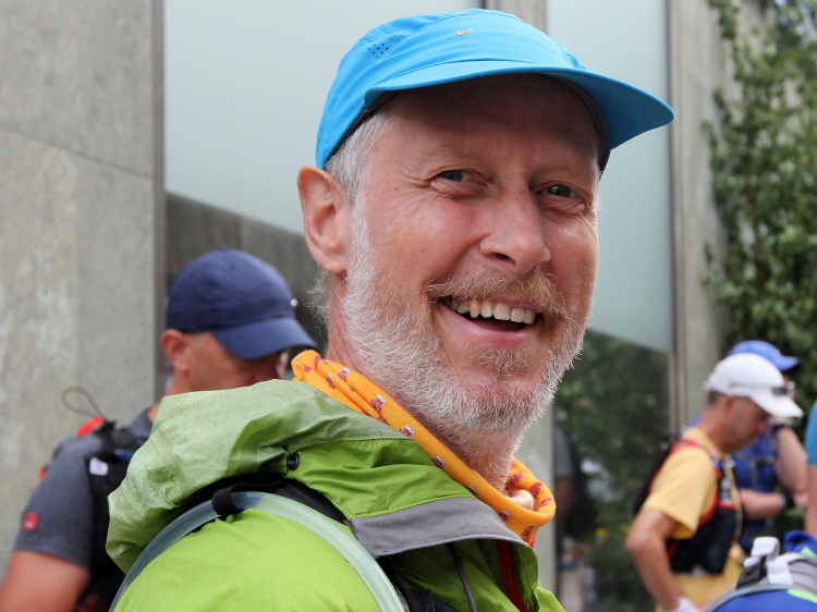 St. Moritz ist Endstation. Luxus überall. Lange Rolltreppen führen ins Zentrum hoch, an Protzschlitten und Superluxushotels vorbei. Mitten in der Fußgängerzone ist die Orga mit der Startnummernausgabe, Gepäck, Startbogen. Es gibt Tische zum Aufrödeln, aber nix zu trinken. Der Brunnen machts, frisches, kaltes Gletscherwasser. Köstlich. Alphornbläser vertreiben unsere Nervosität. Als ein Helikopter auftaucht, hören sie auf, plötzlich wird angezählt und ab geht’s, bergab zum See runter und dann wellig durchs waldige Gelände entlang der Skimarathonloipe.